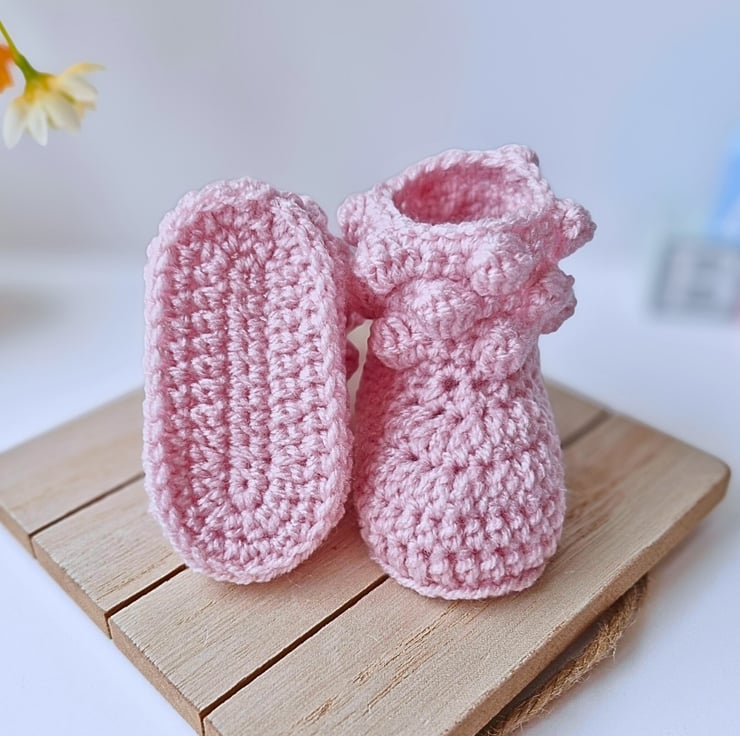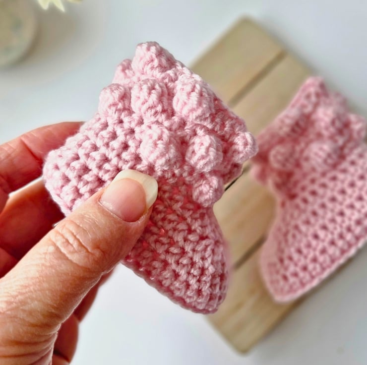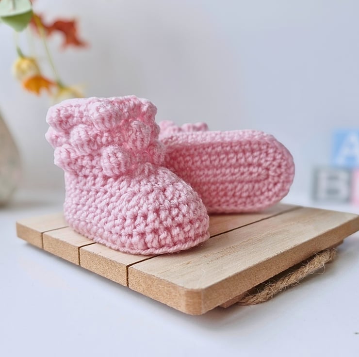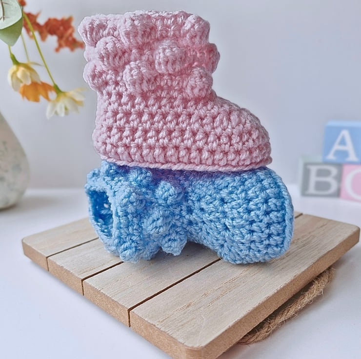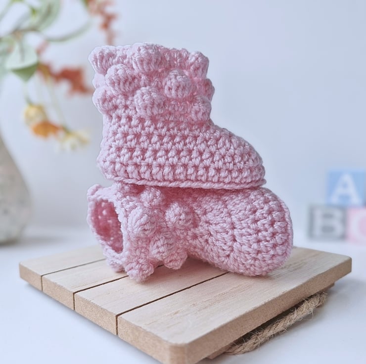 These sweet handmade crochet baby booties feature a textured bobble stitch cuff for a cosy and decorative finish. Soft, comfortable and practical, they are designed to keep tiny feet warm while staying gently in place.