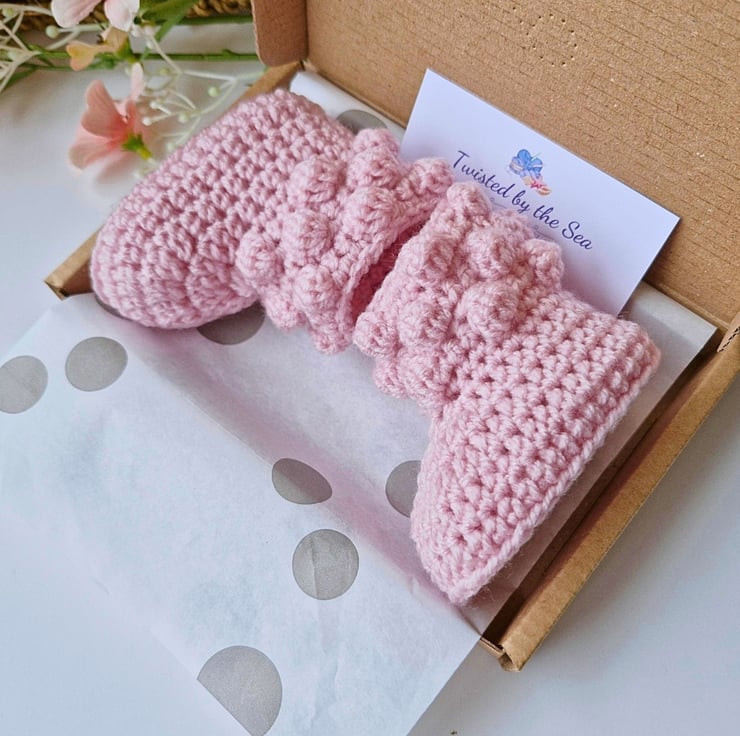 Each pair is carefully crocheted using soft Stylecraft Special DK yarn, making them lightweight, breathable and suitable for delicate newborn skin. A lovely choice for a baby shower gift, new arrival, or a special handmade keepsake.