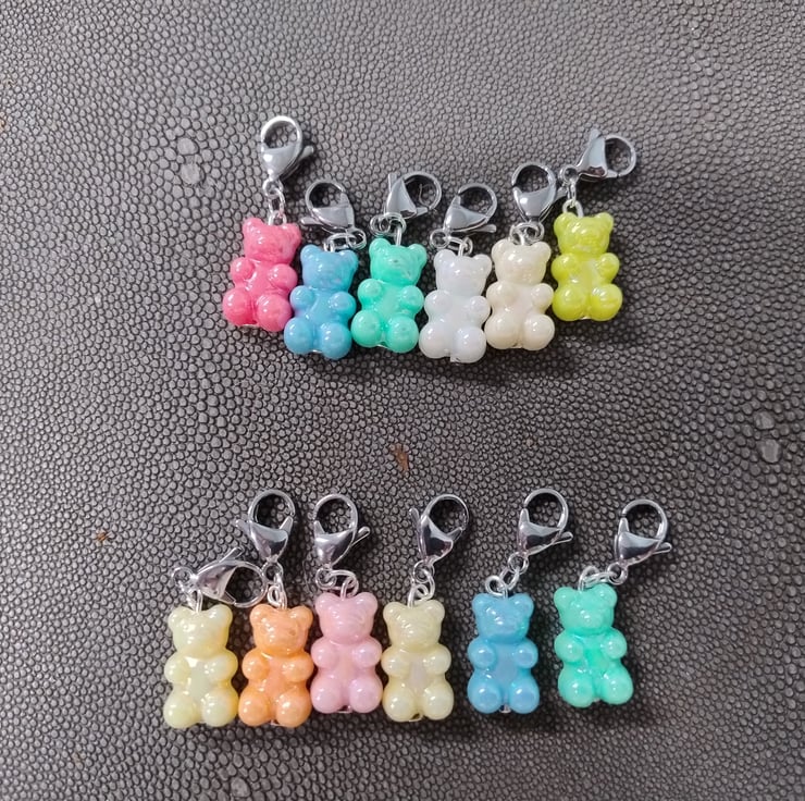 Add a touch of cuteness to your projects with these little Gummy Bear stitch markers. Measuring 1.5cm, these little bears are fitted with a 15mm lobster clasp which keeps the markers securely in place without causing any damage to the yarn.