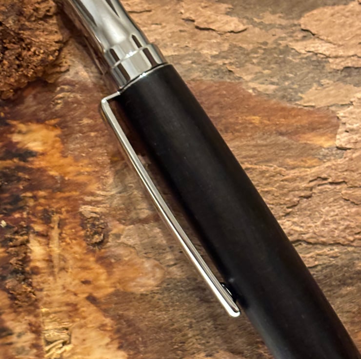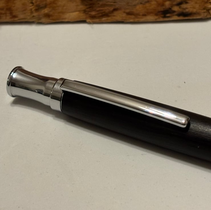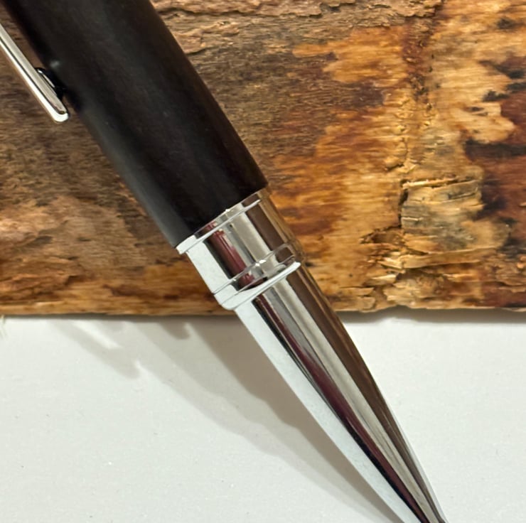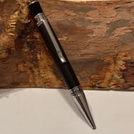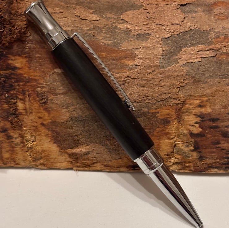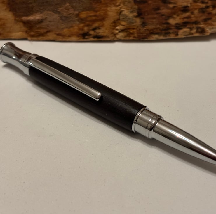 Etasiea style ballpoint has a stunning look by combining the dark coloured Bog Oak with chrome fittings. Handmade by me in my workshop in Leigh.