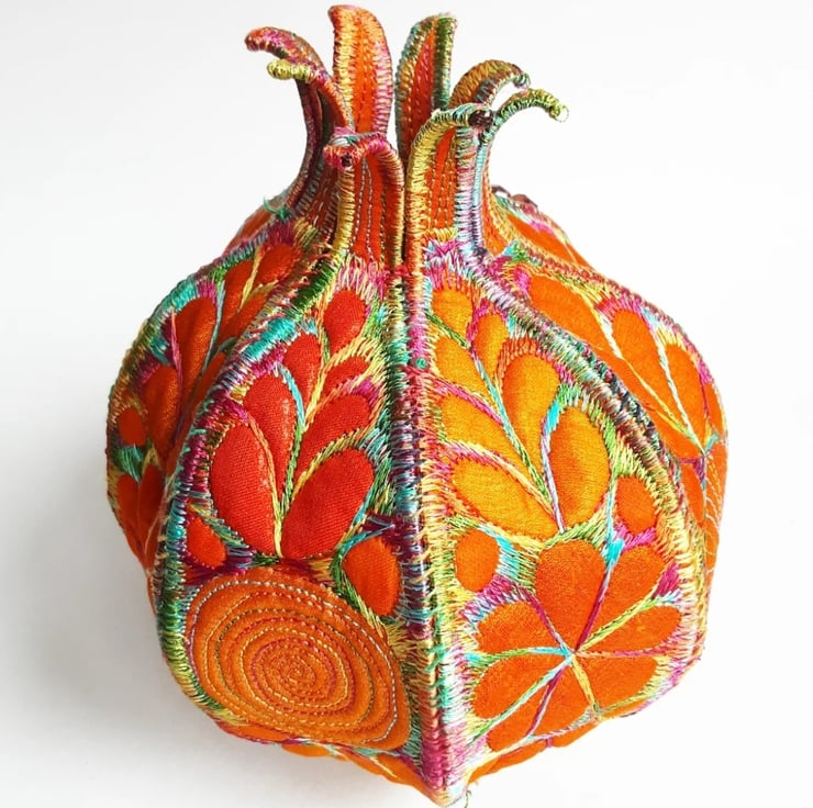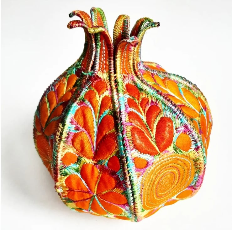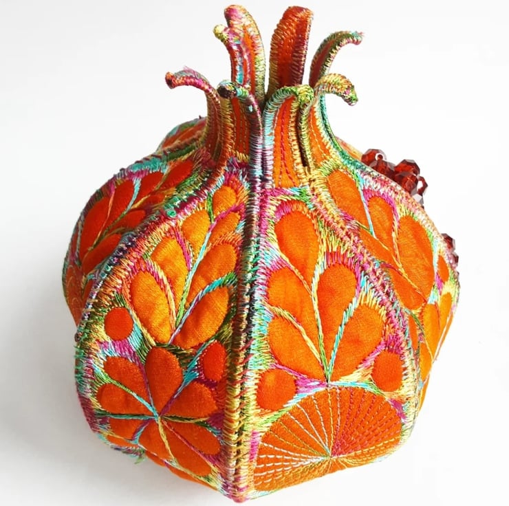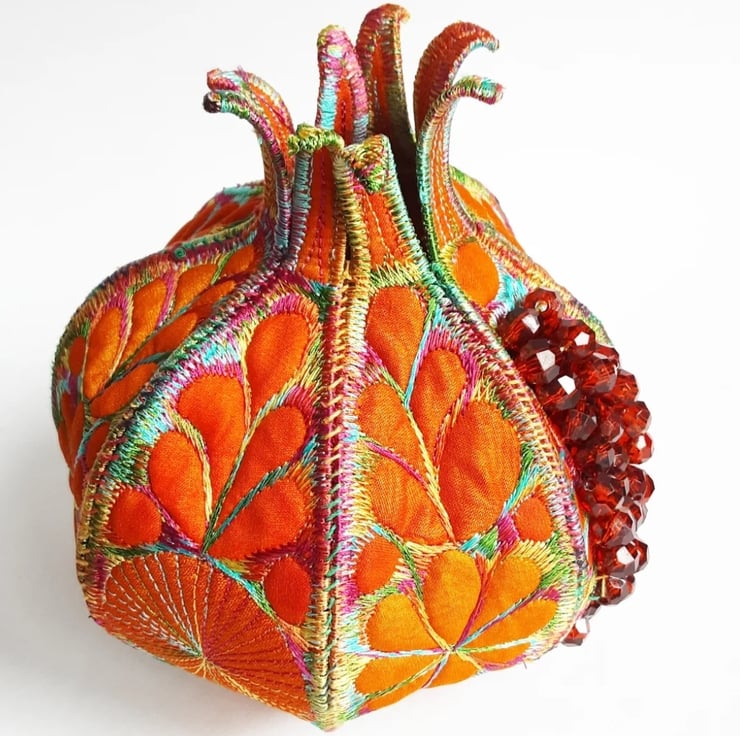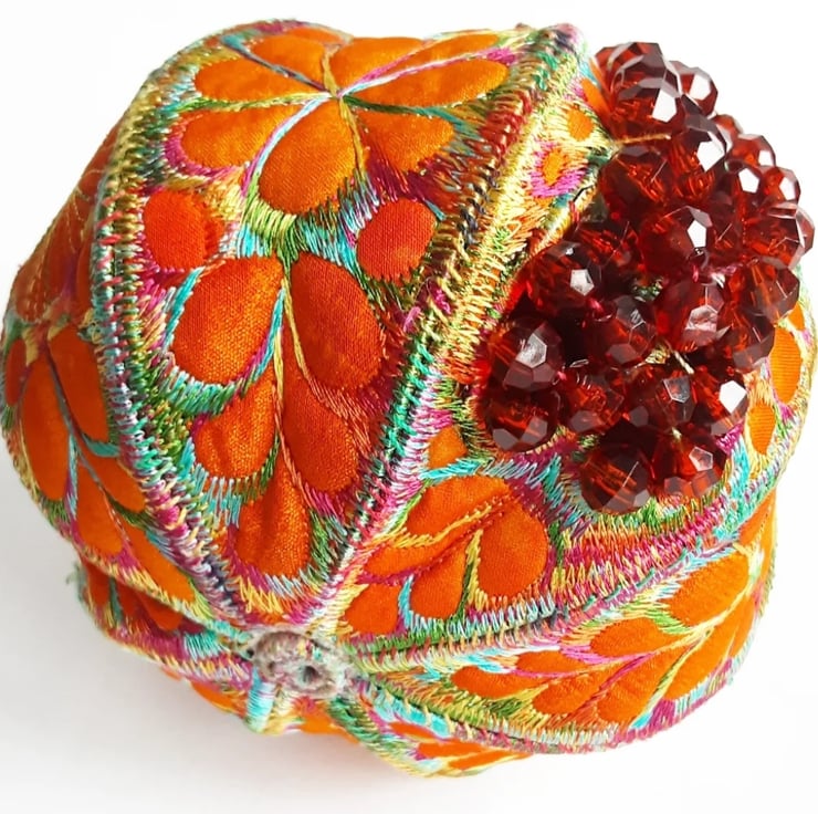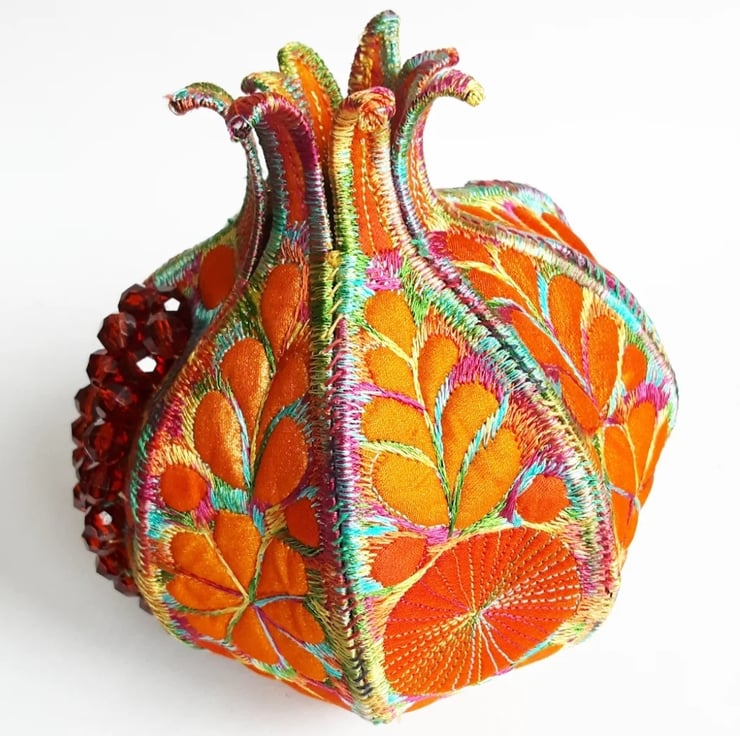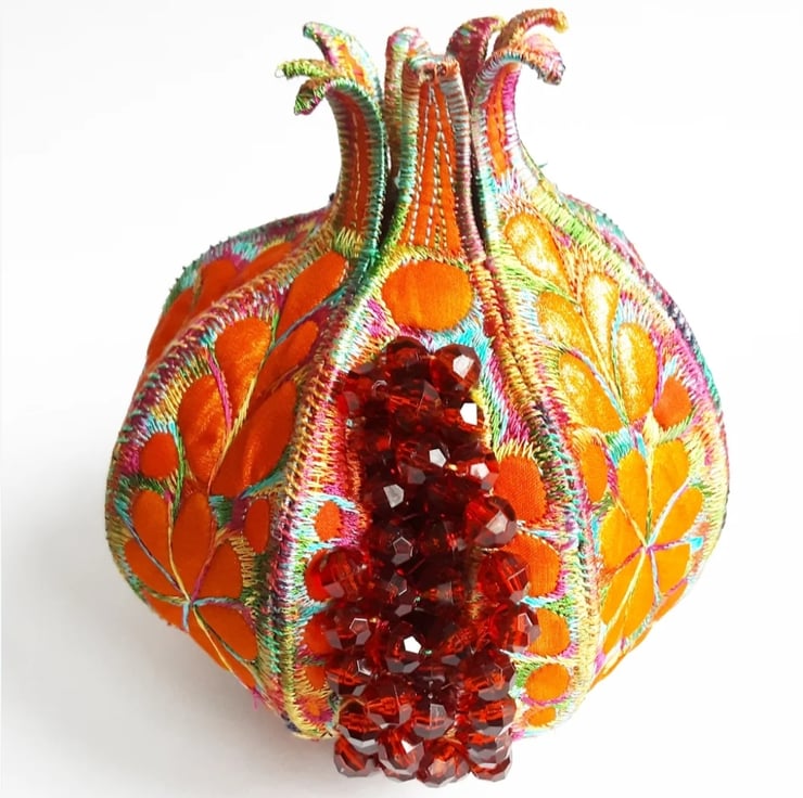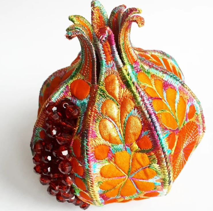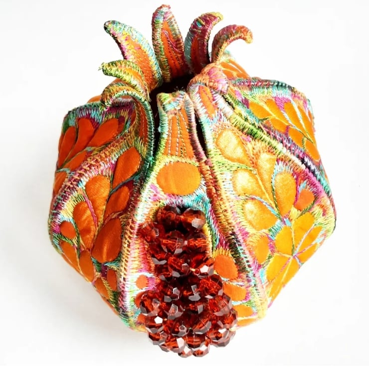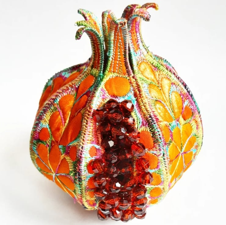 This is a handmade textile pomegranate decoration with beads to represent the seeds coming out of one of the segments.