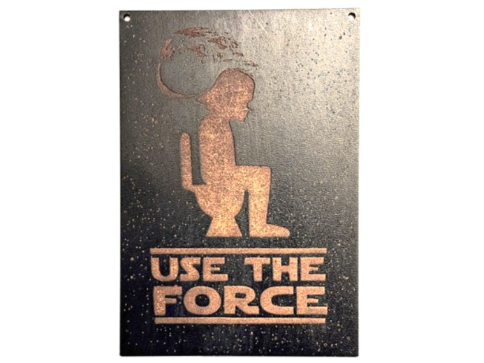 Crafted from high-quality coloured MDF sheet wood, this durable plaque measures 150 mm x 120 mm and features a laser-etched design of a Stormtrooper sitting on the toilet in space, surrounded by shimmering stars and the partially constructed Death Star in the background. The bold, precision-etched text “USE THE FORCE” adds the perfect comedic finishing touch.