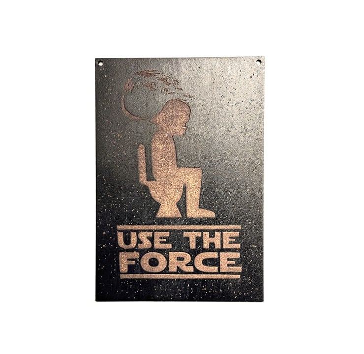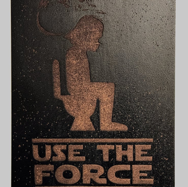 Crafted from high-quality coloured MDF sheet wood, this durable plaque measures 150 mm x 120 mm and features a laser-etched design of a Stormtrooper sitting on the toilet in space, surrounded by shimmering stars and the partially constructed Death Star in the background. The bold, precision-etched text “USE THE FORCE” adds the perfect comedic finishing touch.
