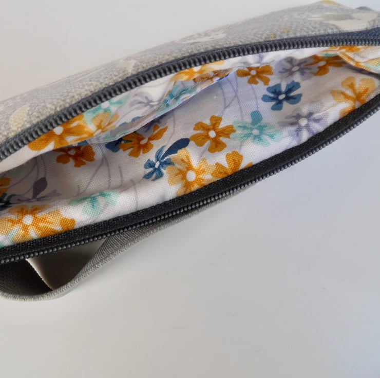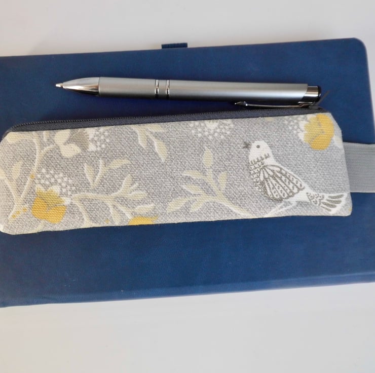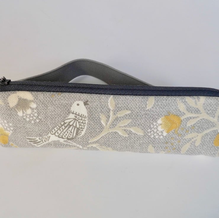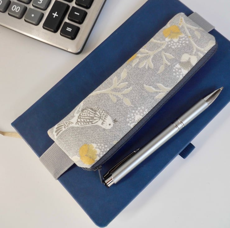 I made this pencil case using a light grey furnishing weight fabric printed with little birds and yellow flowers. I backed this outer fabric with fusible fleece and then machined three lines of wave stitch on each side to make it slightly quilted. Lined with a modern floral quilting cotton.