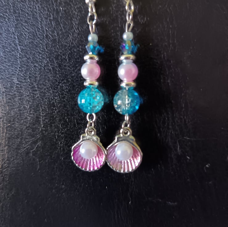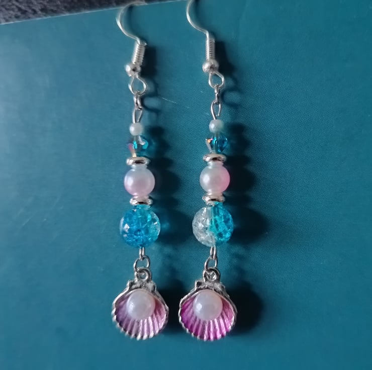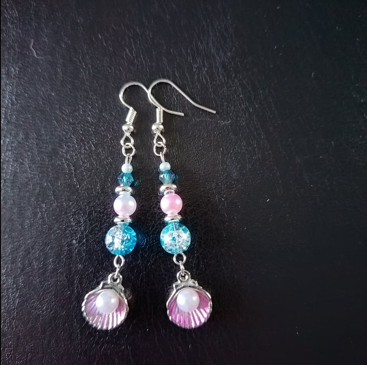 These handmade earrings are crafted with stainless steel hooks, pink and silver shell charms with decorative pearls, silver spacers, blue glass beads and pastel faux pearl beads.