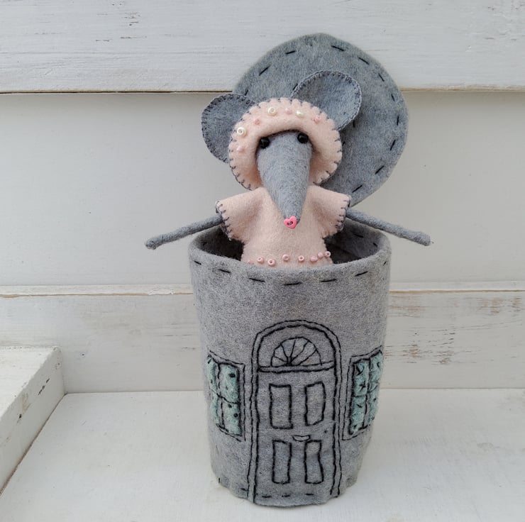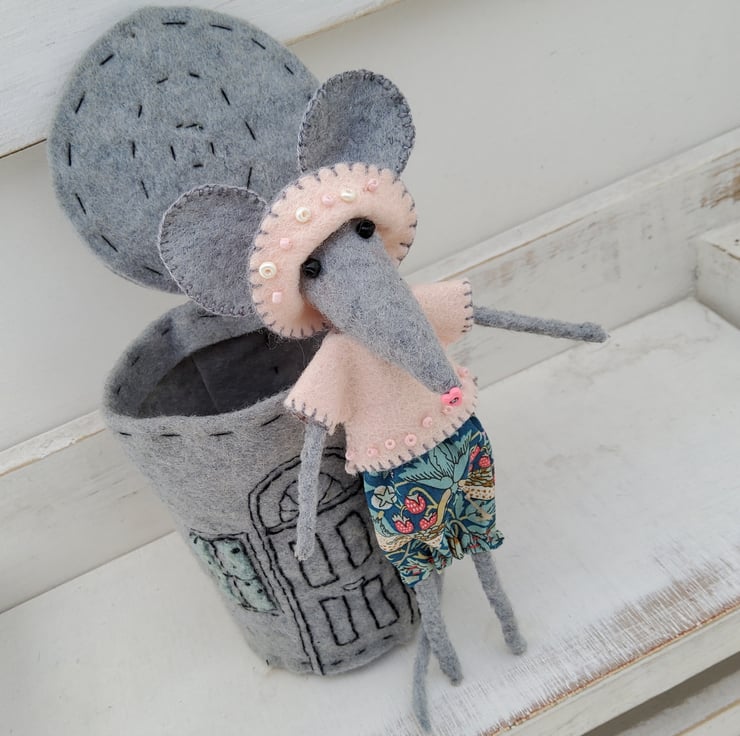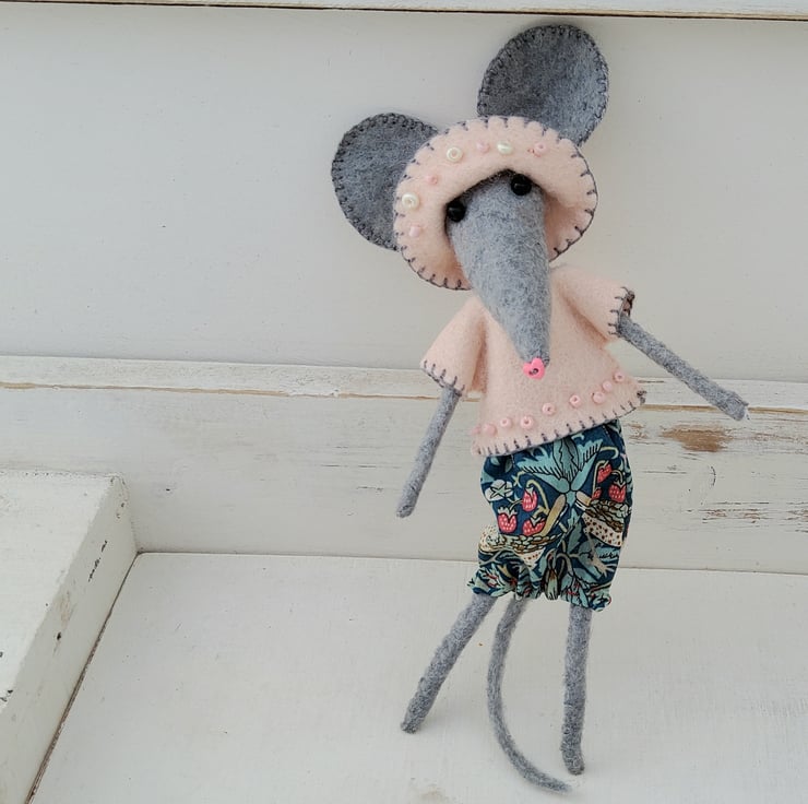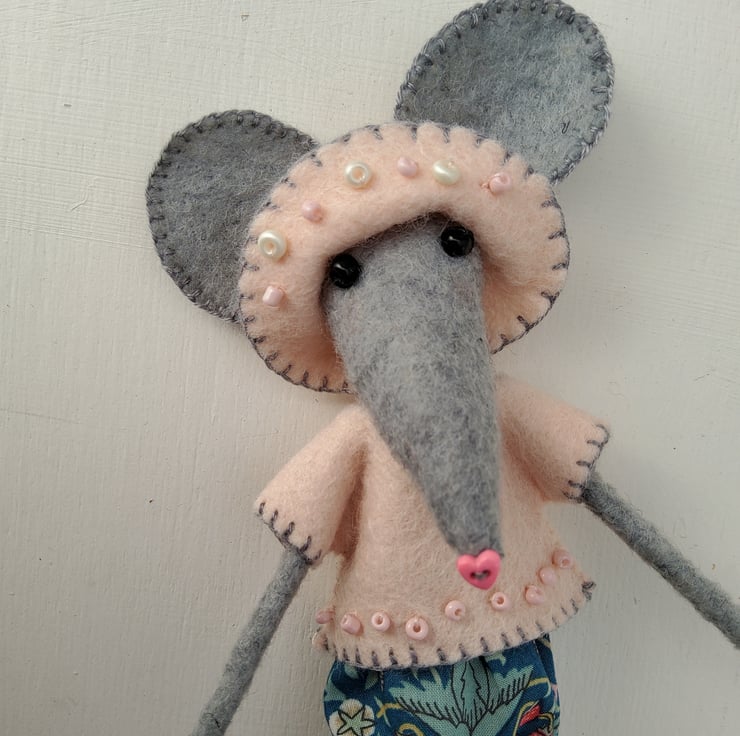 Miss Mouse has been made from wool felt and entirely handstitched. She is posable as she has wired arms and legs. She has glass bead eyes and a tiny pink heart button nose. Her skirt is made from Liberty fabric and her felt top and hat have been blanket stitched and finished with tiny beads. You can remove her hat (carefully). She is about 16cms tall including her ears.