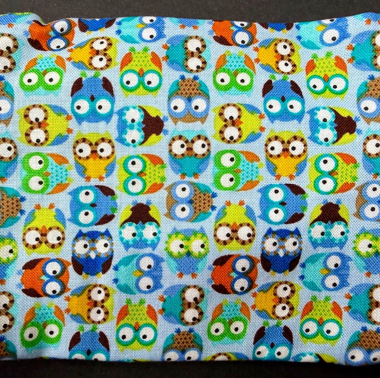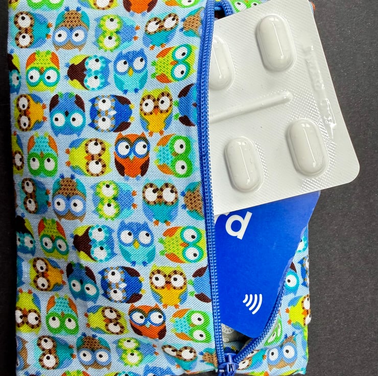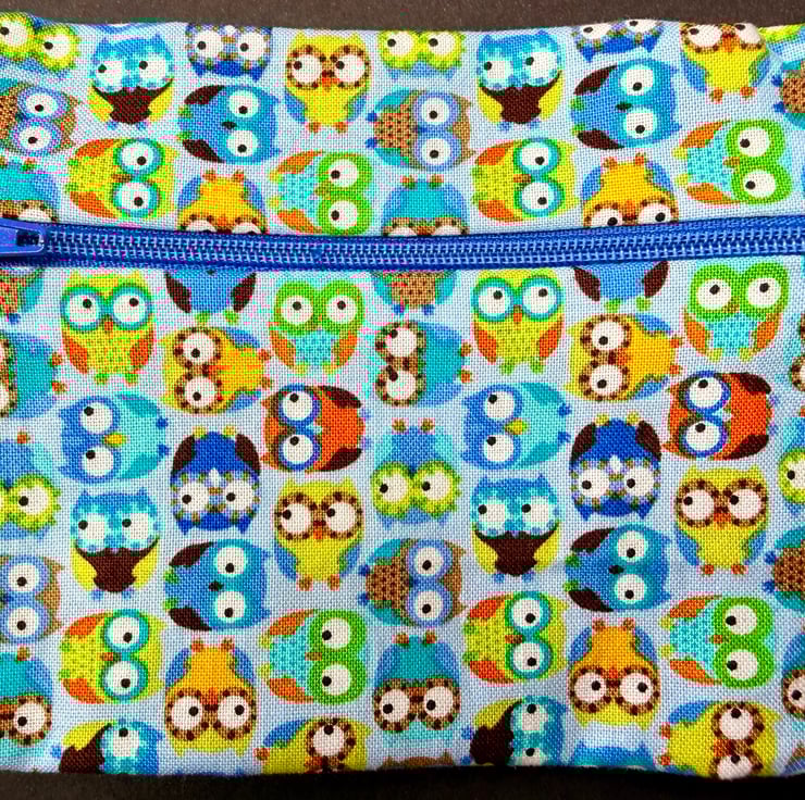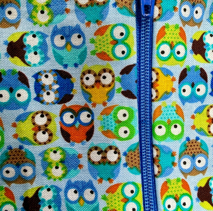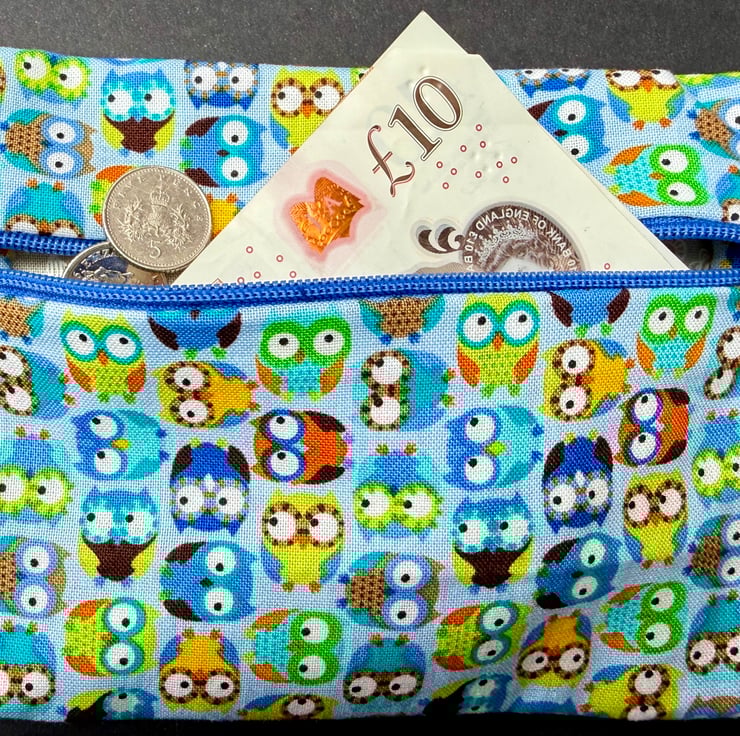 This compact zipped purse is made from a light blue cotton covered in small owls in many colours, each one with its own expressive little face. The print is full of character and gentle humour and has a lovely appeal for both children and adults. The front panel is finished with an easy glide mid blue zip that matches the background perfectly.