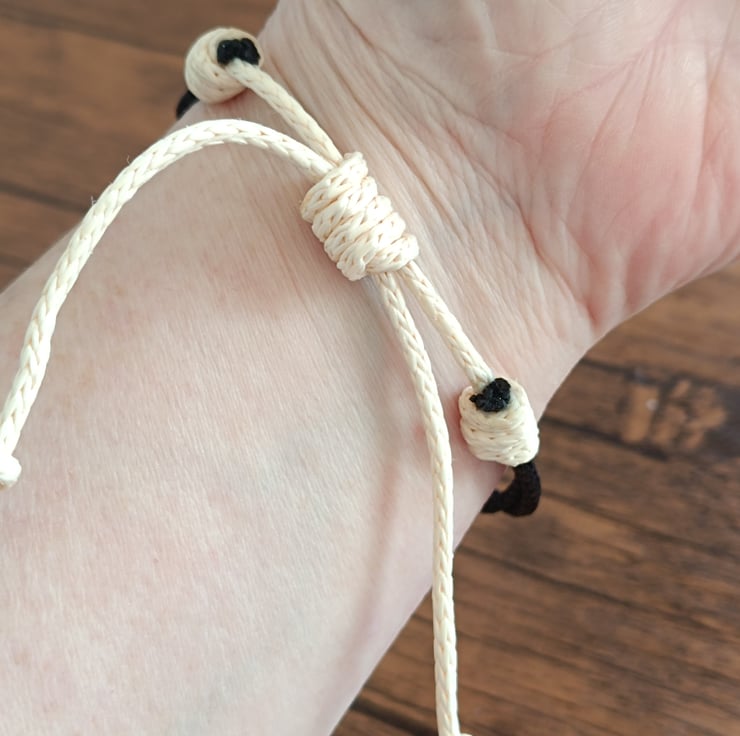 This handcrafted bracelet combines intricate knotting techniques with classic metallic accents, creating a timeless accessory suitable for any wardrobe.