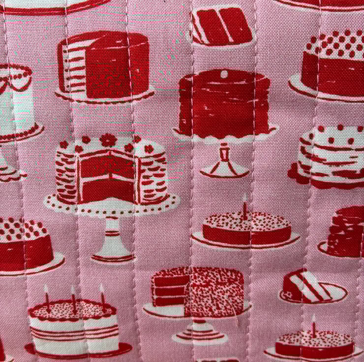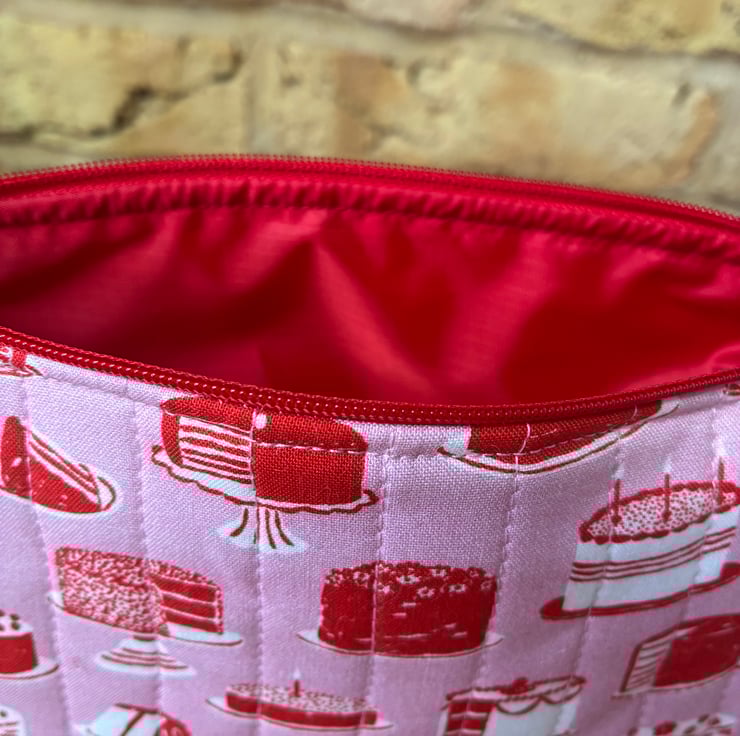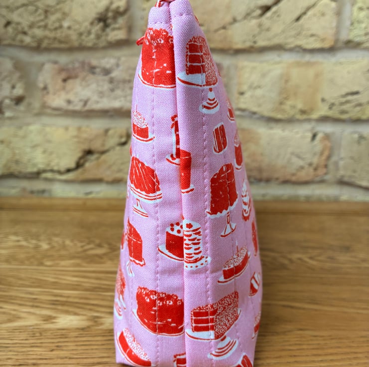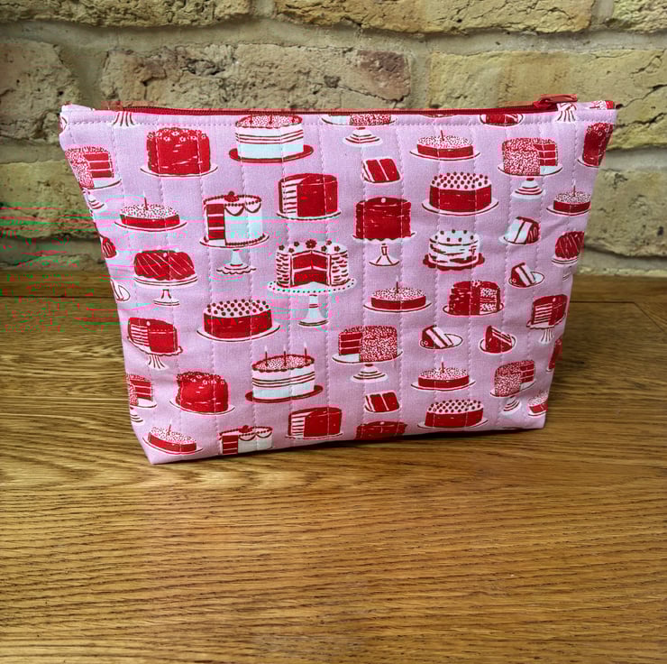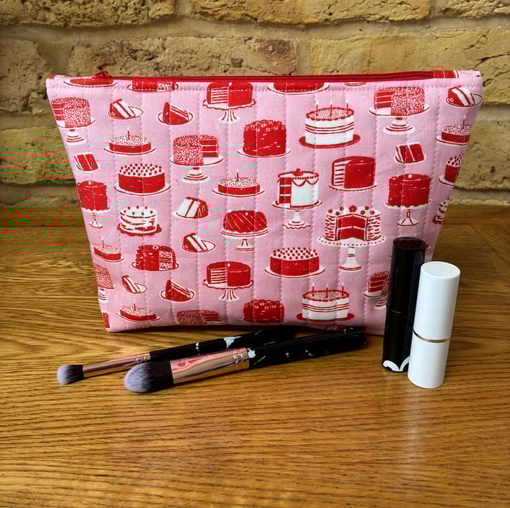 The quilted makeup bag is made from this lovely cakes print fabric.