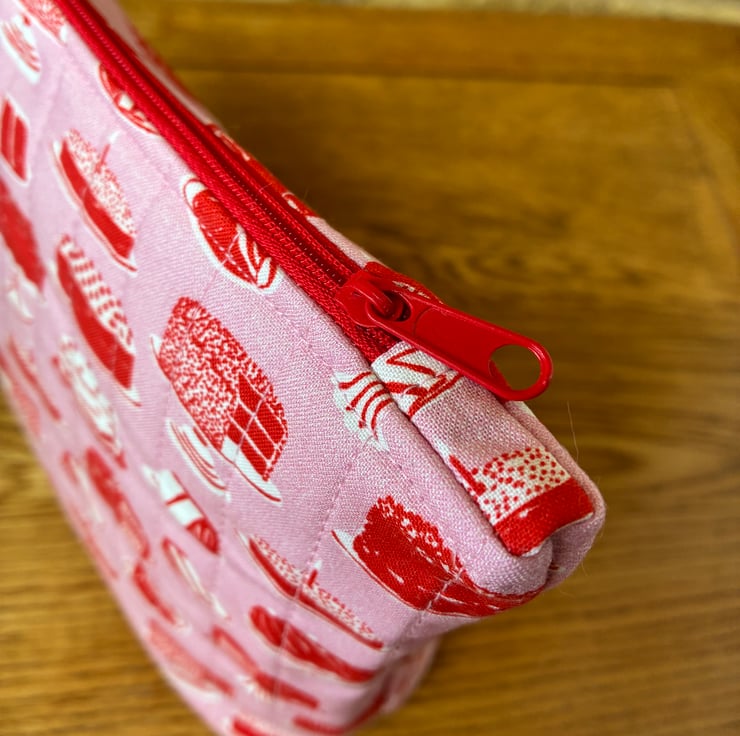 The bag is quilted with pink stitching and the red zip is finished with tab ends.