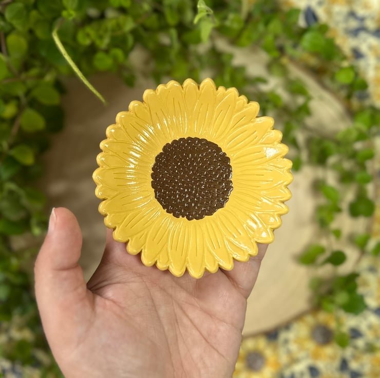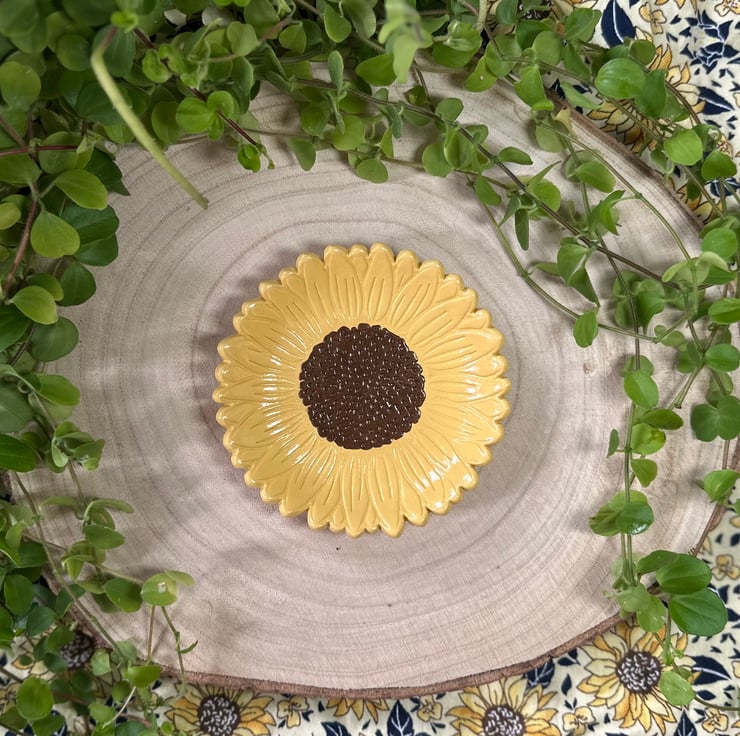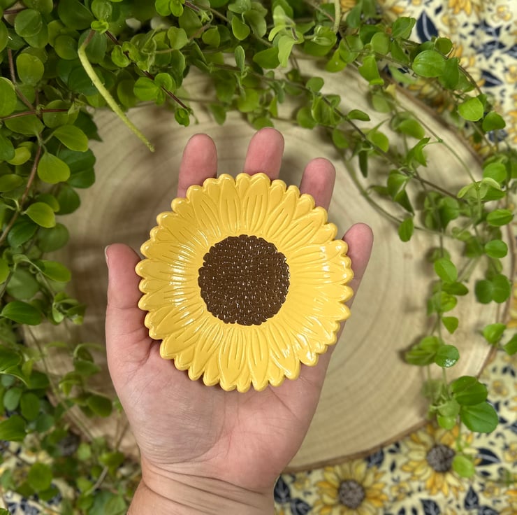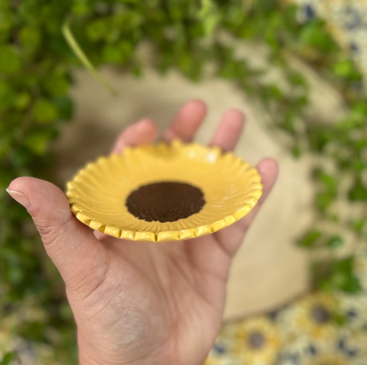 Add a touch of sunshine to your home with this handmade sunflower ring dish, carefully hand stamped and hand painted using air dry clay.