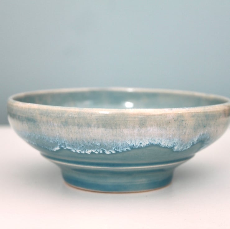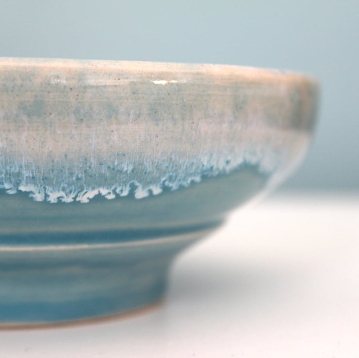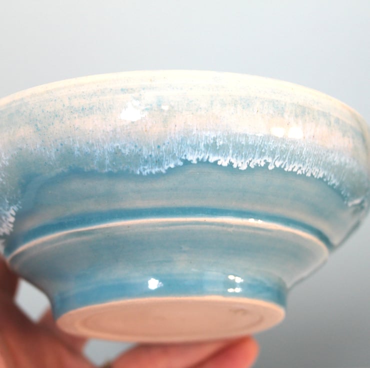 Wheel thrown bowl, glazed in a lovely blue colour with a white effect making it look like the ocean. The bowl fired to c1200 degrees (stoneware temperature) which makes it durable and suitable for everyday use.