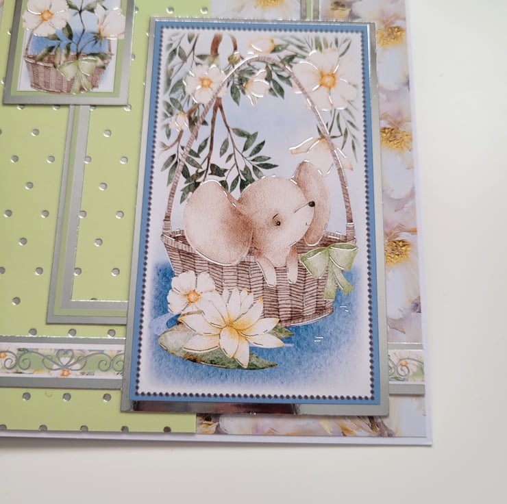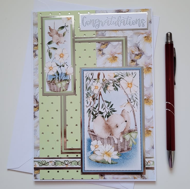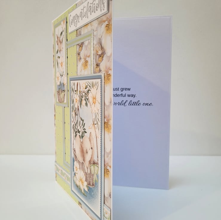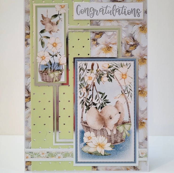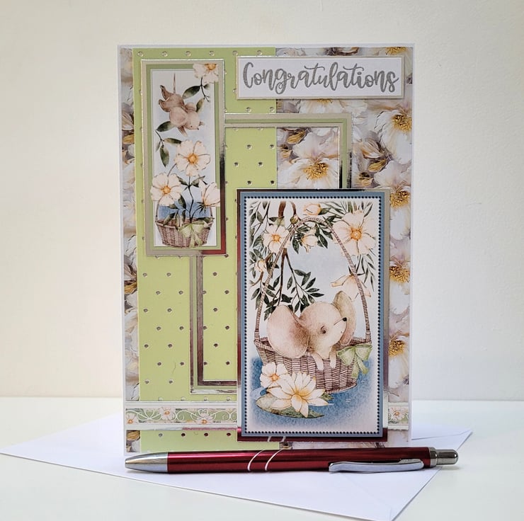 Celebrate the arrival of a precious new baby with this beautifully handmade congratulations card. Featuring a sweet watercolour-style baby mouse resting in a basket surrounded by soft florals, this charming design is perfect for welcoming a newborn.