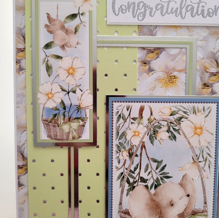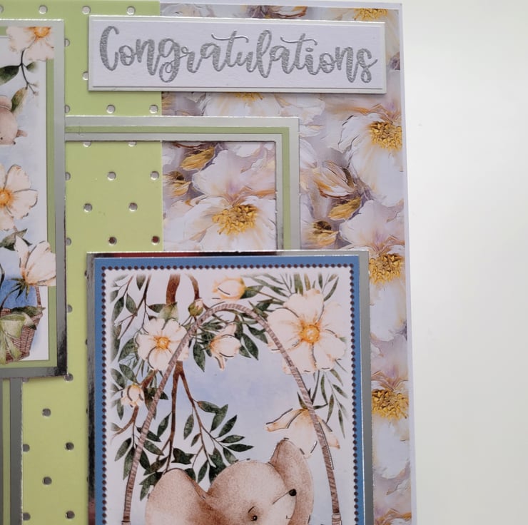 The soft green tones and delicate flower details make this a lovely gender-neutral baby card, ideal for baby boys or baby girls. The layered paper design and dimensional elements add a special handcrafted touch that makes this card a keepsake parents will treasure.