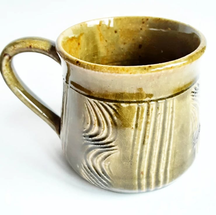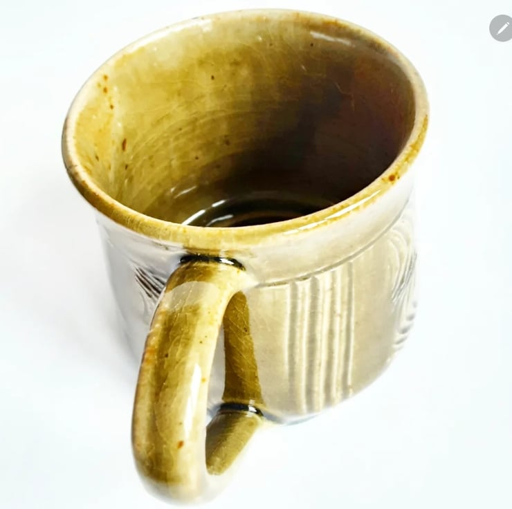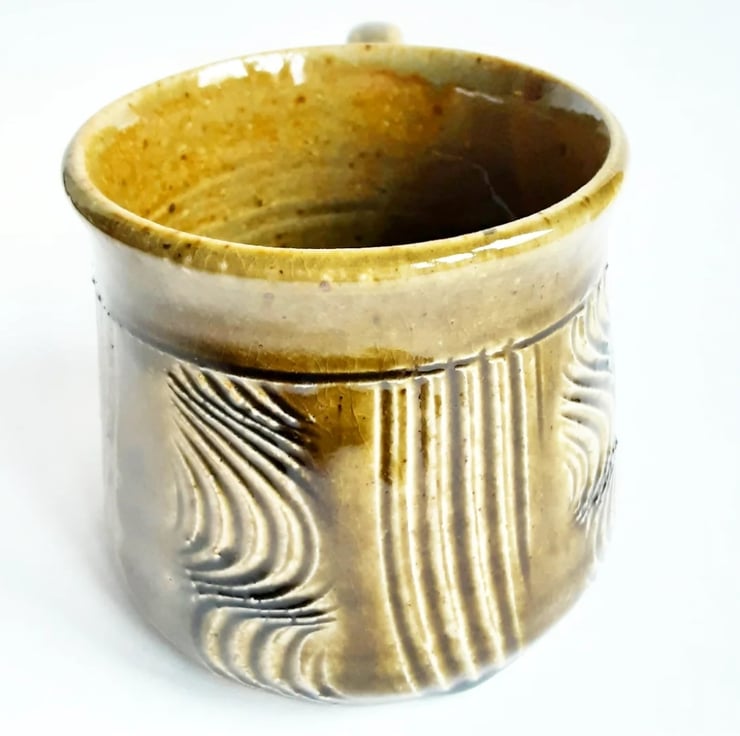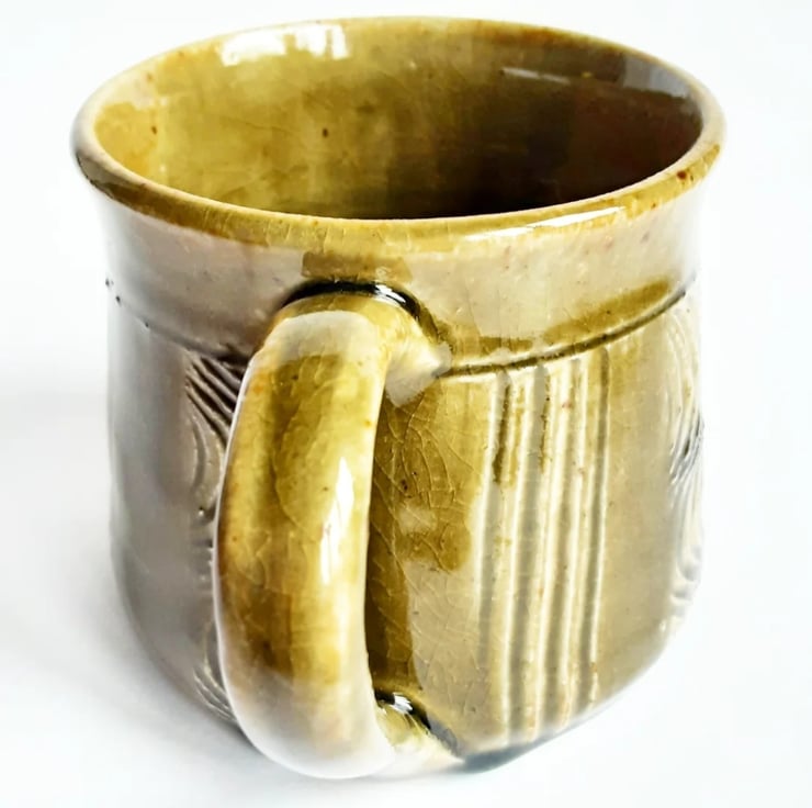 Glazed in brown glazes with a pattern on the mug.