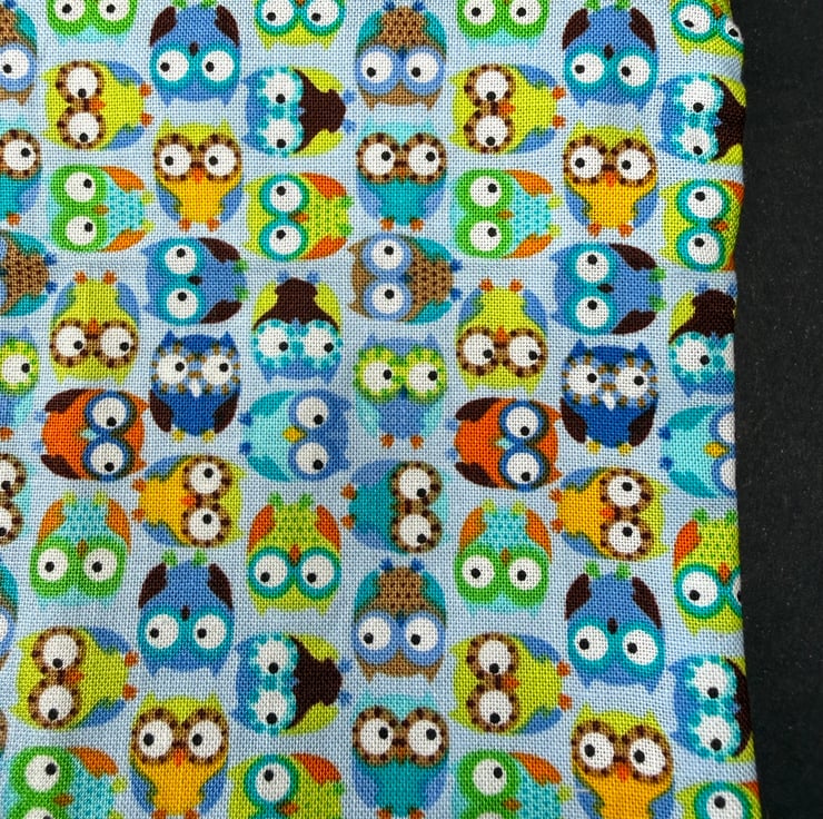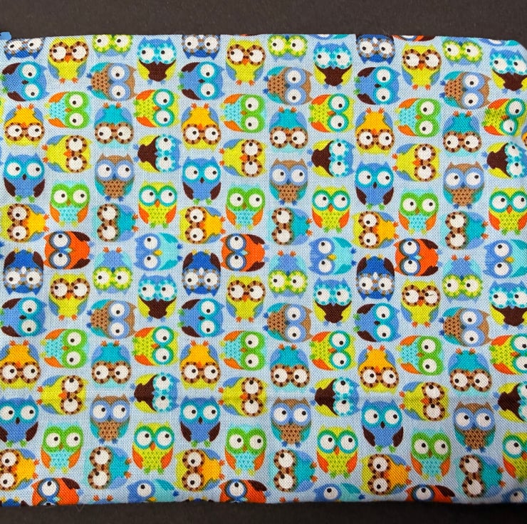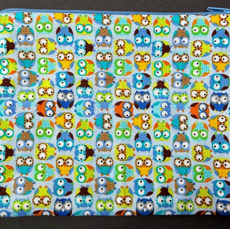 This medium sized zipped pouch is machine sewn from cotton fabric and designed to be a bright practical addition to your daily bag or travel kit. The outer fabric features charming small owls in multiple bright colours on a light blue background. The print feels playful and uplifting and the mix of colours gives the pouch a lively friendly character. The top is finished with an easy glide mid blue zip that blends beautifully with the tones of the fabric.