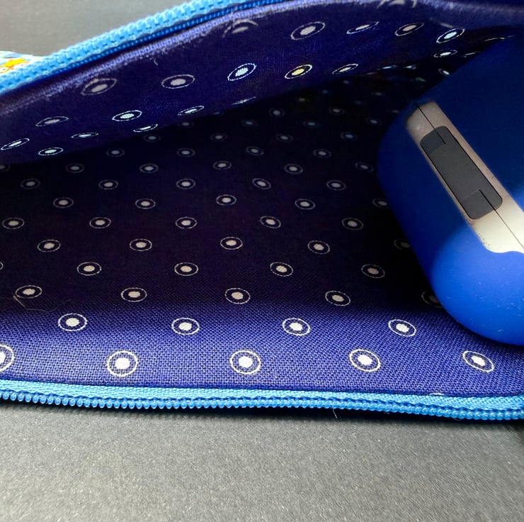 The inside is lined with a darker blue cotton printed with circled white dots. The lining adds a gentle contrast and makes it easy to see what is inside. All seams are neatly finished so the pouch feels smooth strong and well made.