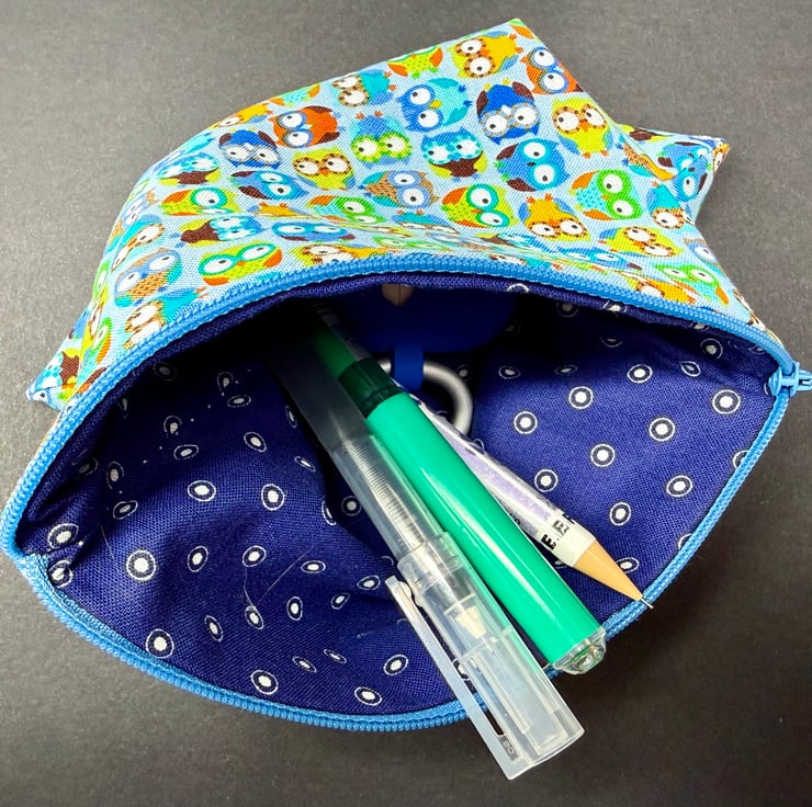 This pouch began with the owl fabric which felt instantly joyful. The bright colours and round expressive shapes give the design a playful charm and the mid blue zip was chosen to echo the background tones. The darker blue lining with its white dots adds a soft calm contrast inside. The aim was to create a roomy practical pouch that feels quietly elegant and is versatile enough for daily use or travel.