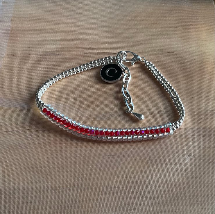 Handmade Sparkly Ruby Red  Beaded Bracelet -Personalise with initial charm