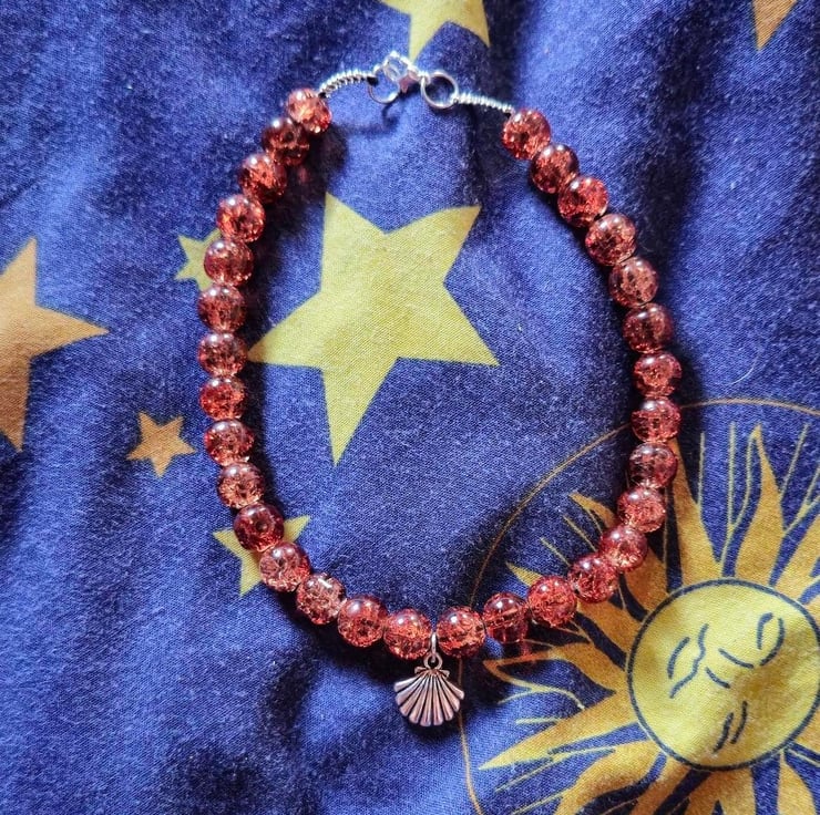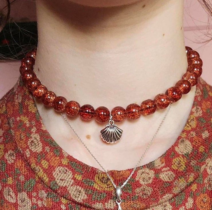 Handmade orange glassy beaded choker necklace with silver plated sea shell charm