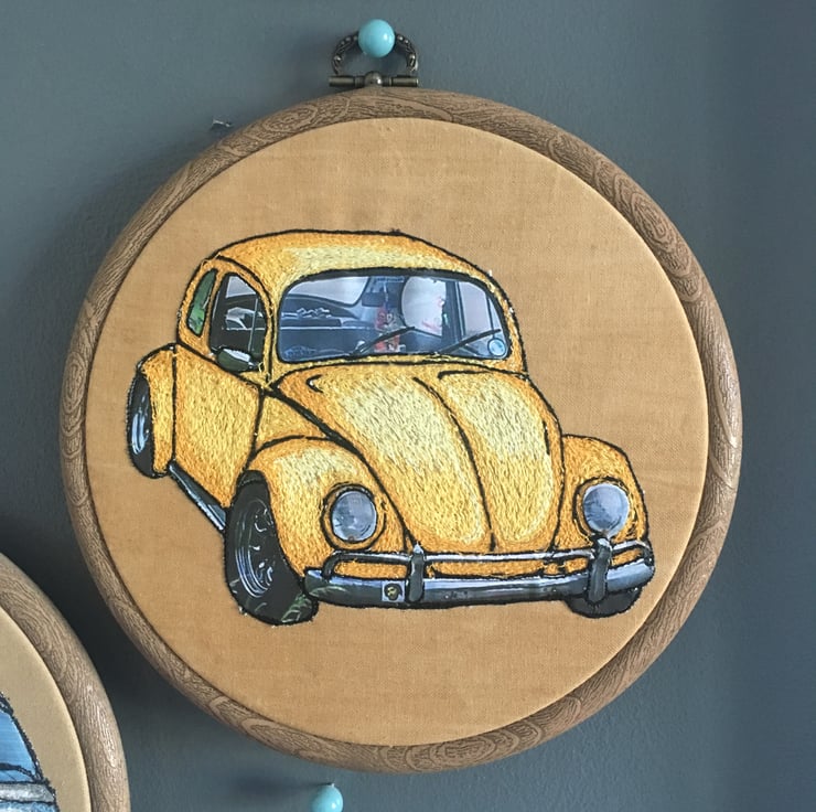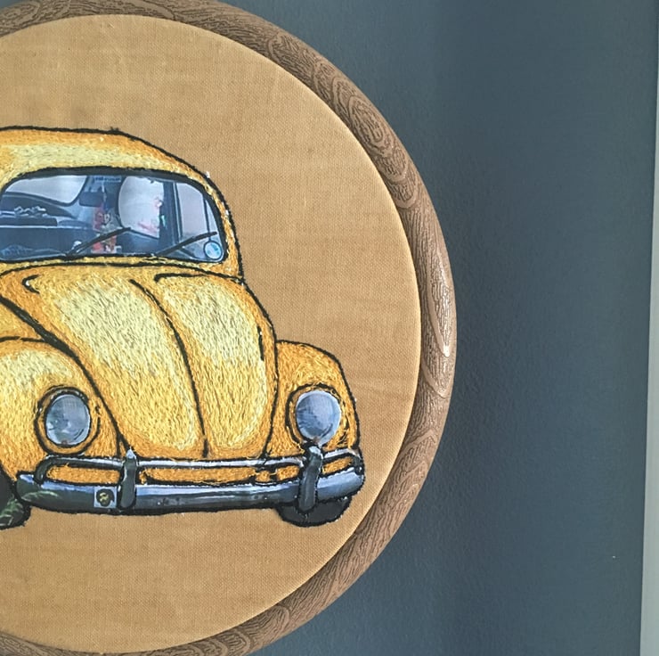 Yellow embroidered VW Beetle with a mix of threads and paper.