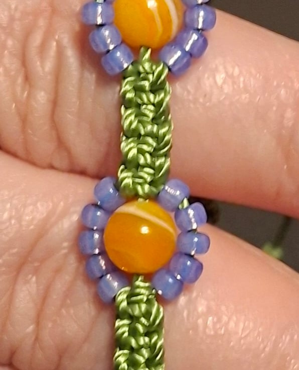 The stone in the middle of the daisy is orange dyed agate and they a surrounded by miyuki seed beads