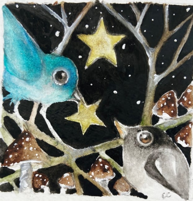 I am painting little whimsical pieces , childhood memories of enchanted tales