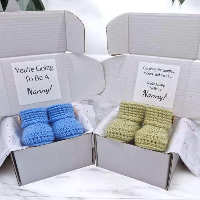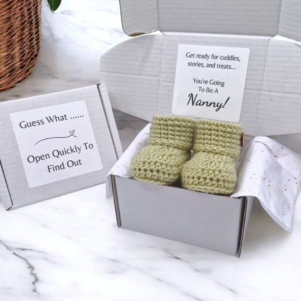 A thoughtful and memorable way to share your pregnancy news with a soon-to-be Nanny or Grandad. This handmade pregnancy announcement gift features a pair of crochet newborn baby booties, presented in a compact, letterbox-friendly gift box for an easy and surprise reveal.