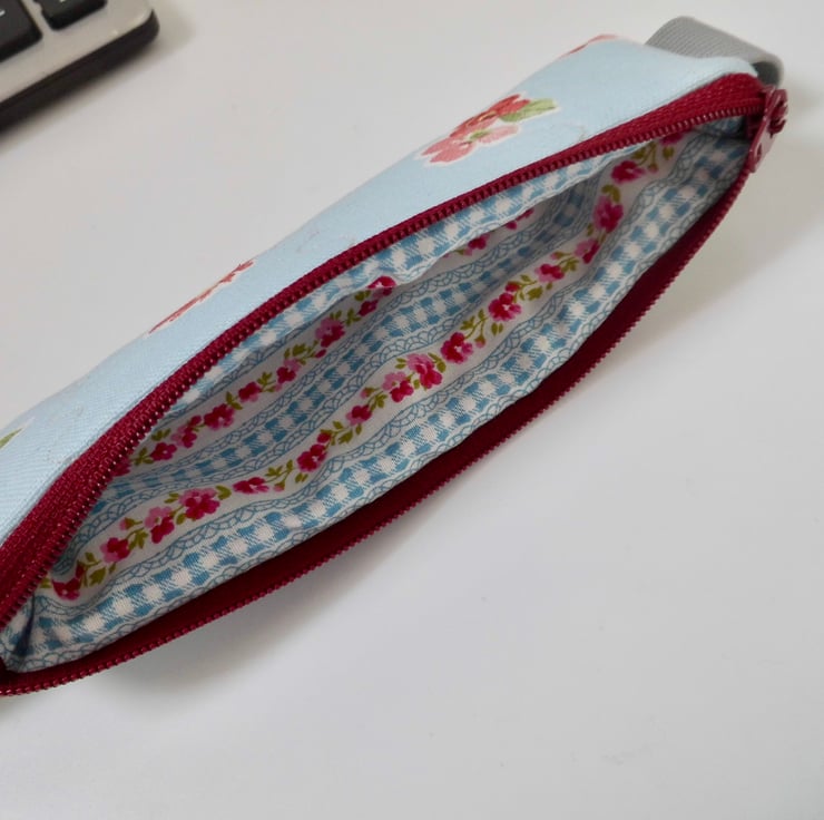 This pencil case has been made from a furnishing weight cotton fabric which has a blue background with pink floral print. I backed this fabric with fusible fleece and then machined three lines of wave stitch on each side to make it slightly quilted. Lined with a floral and check quilting cotton..
