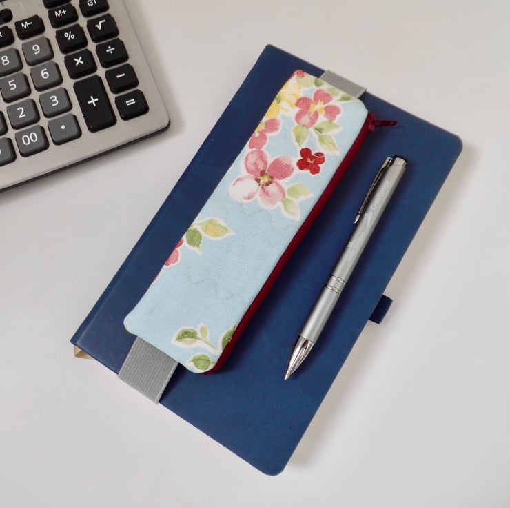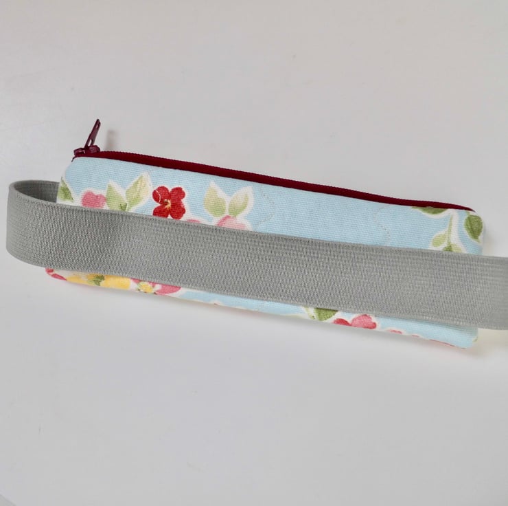 It has a dark red zip across the top. The elastic is grey and 25mm wide. The pencil case measures about 17.5 cm x 5cm and I have shown it here on the cover of a book 21cm tall and it fits perfectly.