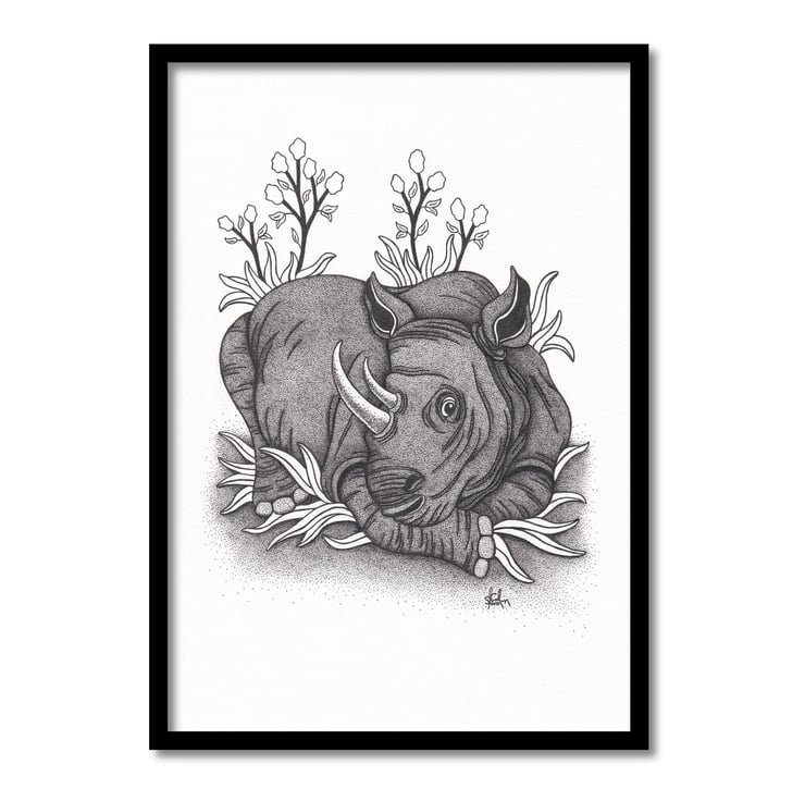 A one of a kind original art called Rhino. Handmade pen and ink drawing on off white/cream paper Due to the original nature of this artwork pencil marks or minor ink smudges maybe seen. This drawing was created within a sketchbook and has a perforated left edge. Signed on the front and dated on the back.