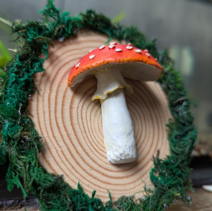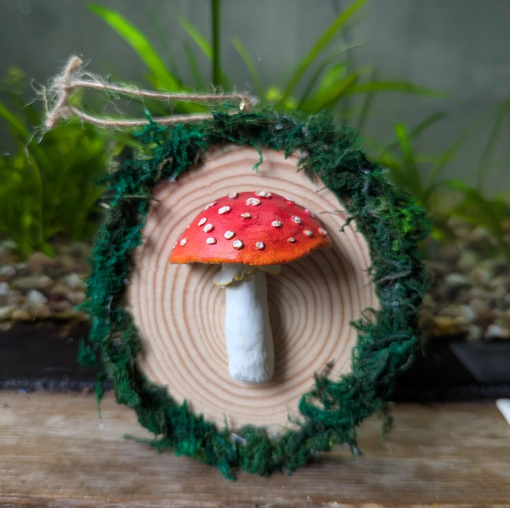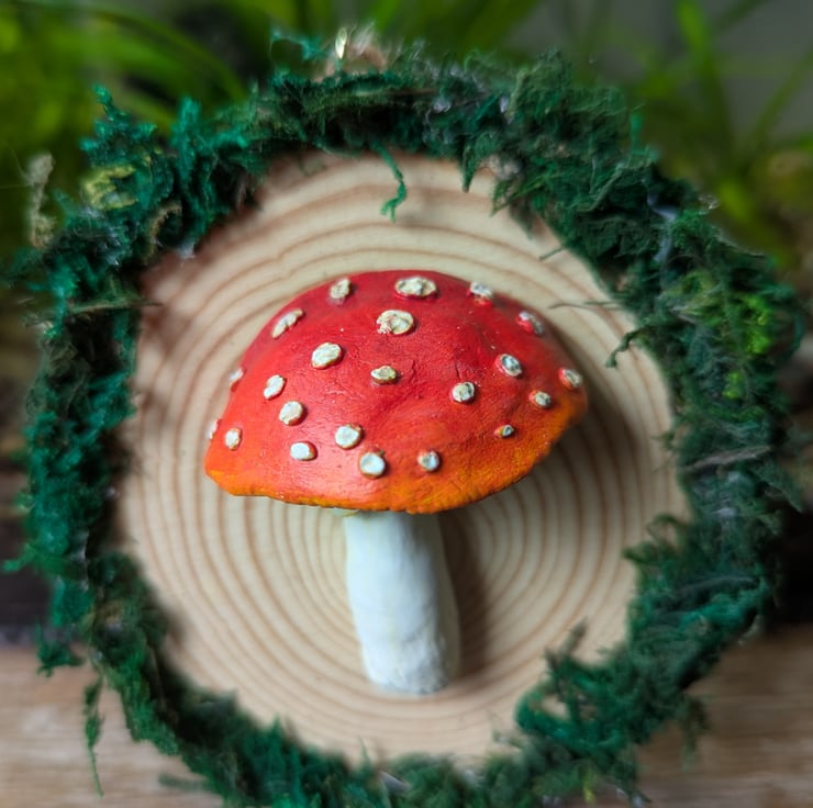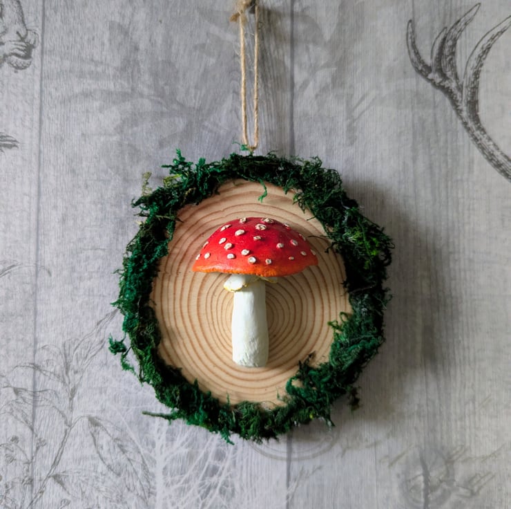 This is a handmade and hand painted, clay Fly Agaric mushroom/ Toad Stool, mounted onto an MDF wooden log, adorned with faux moss. - fitted with an eye and string for easy hanging.