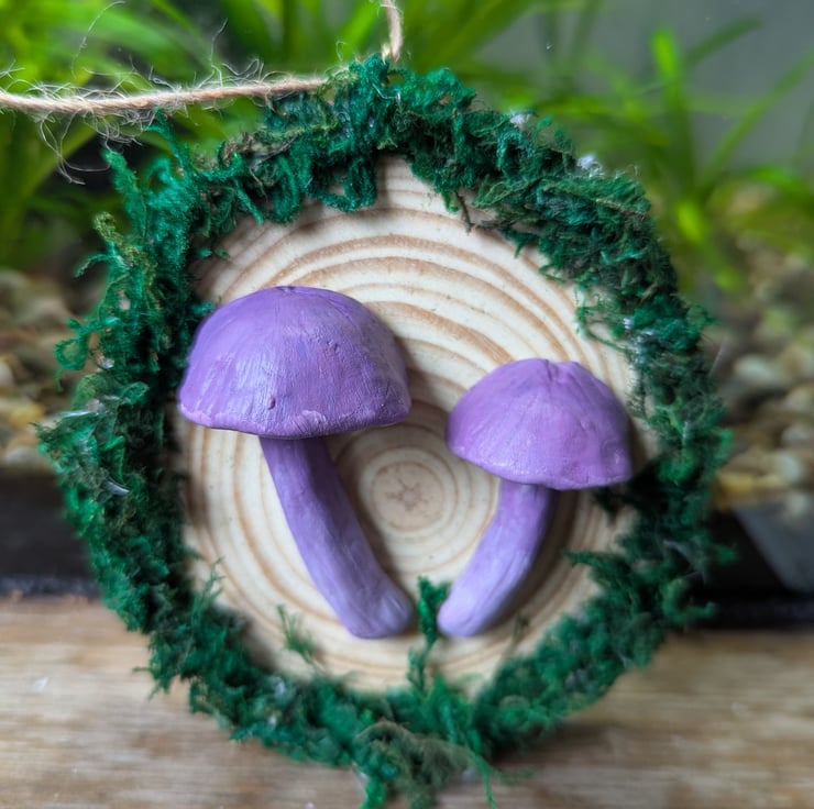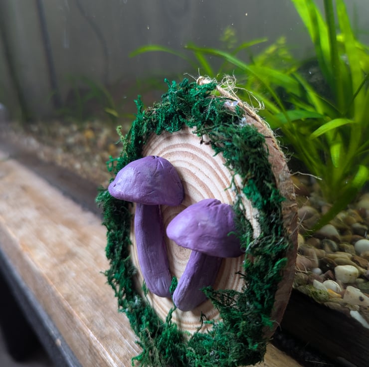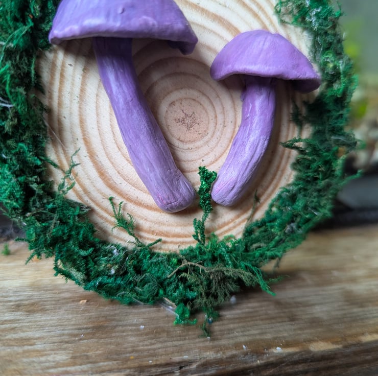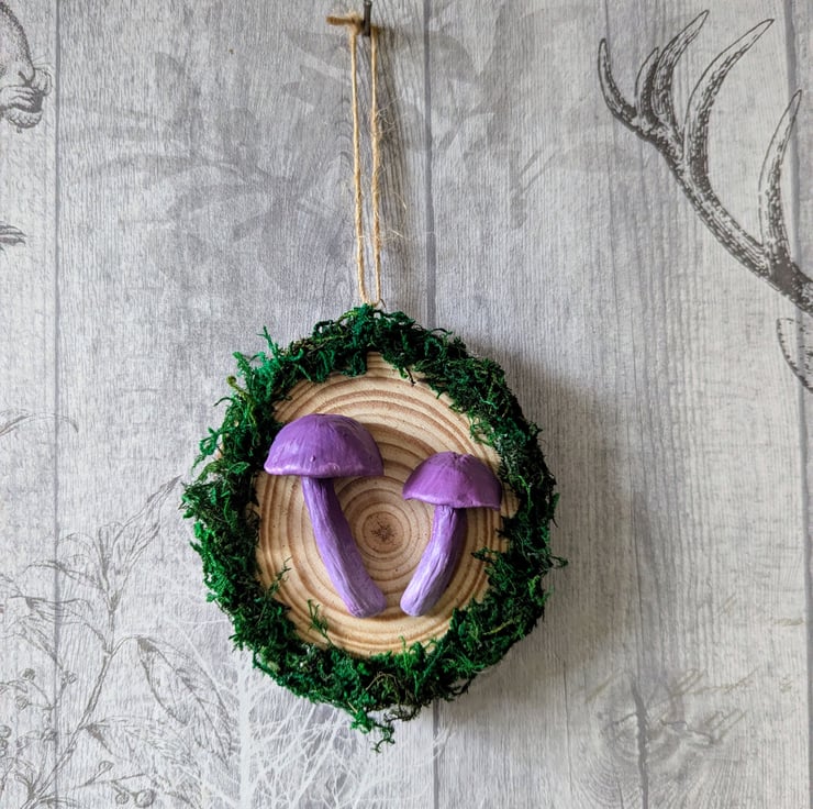 This is a handmade and hand painted, clay Amethyst Deceiver, mounted on an MDF wood slice, decorated with faux moss. - fitted with an eye and string for easy hanging.