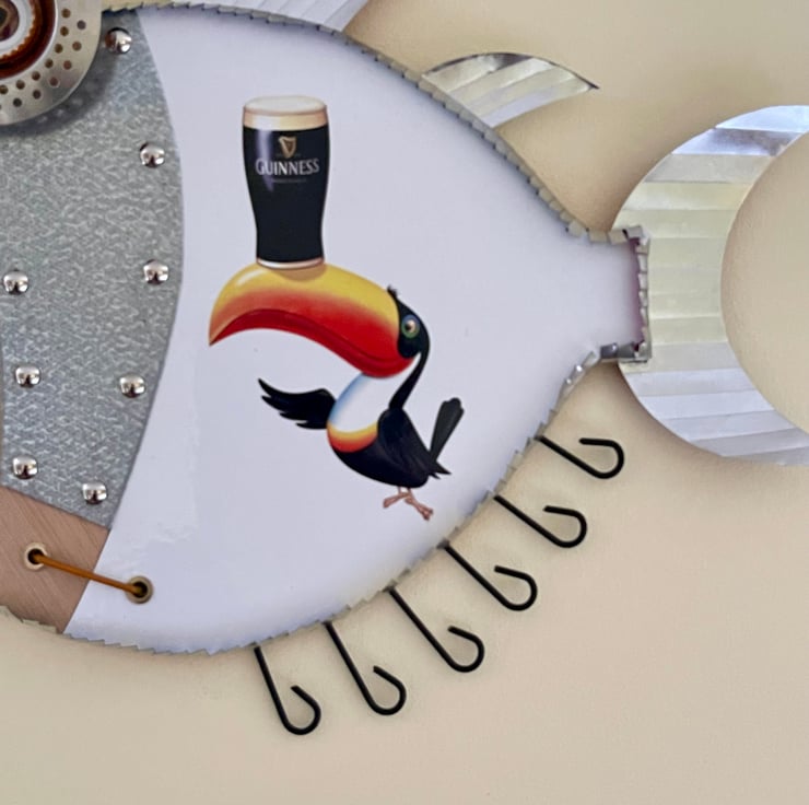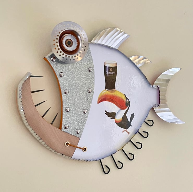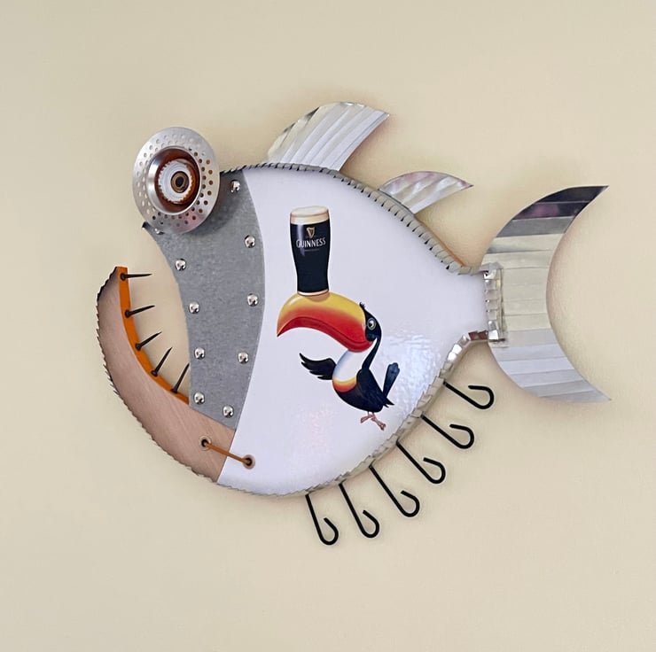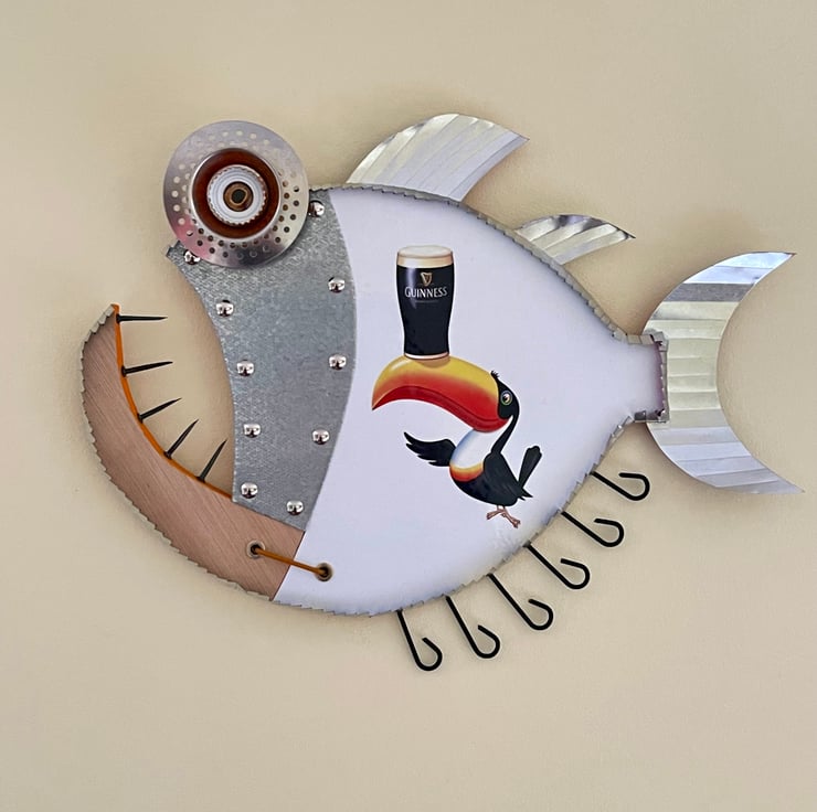 Welcome to my listing, this Guinness fish has been hand made by myself from recycled wood , Metal, Aluminium rod, bottle tops, Cans and plenty of imagination. Would make an ideal gift for any Guinness fans.