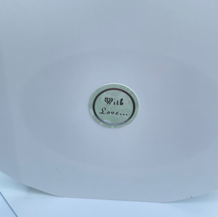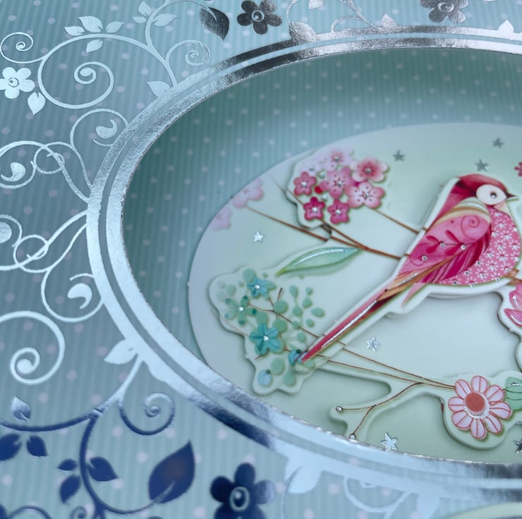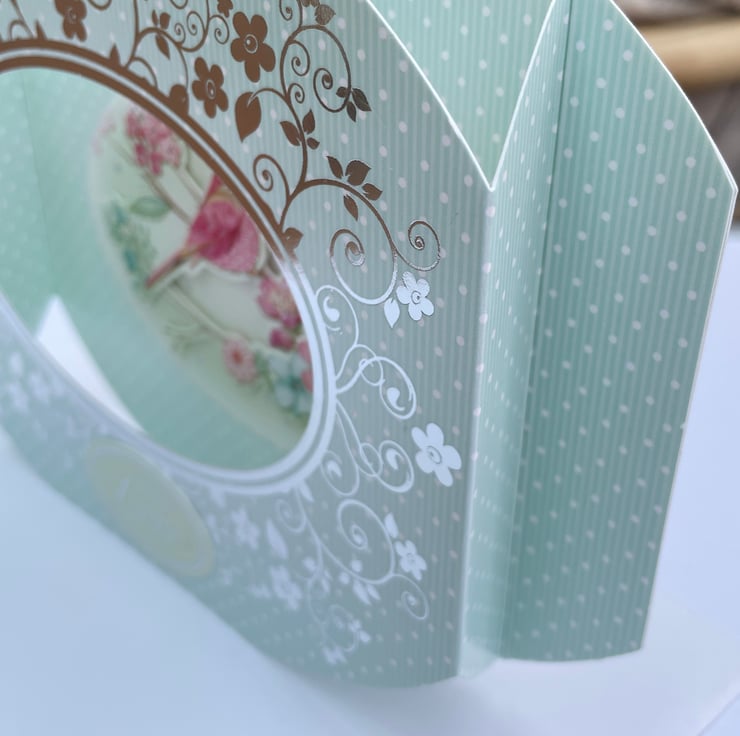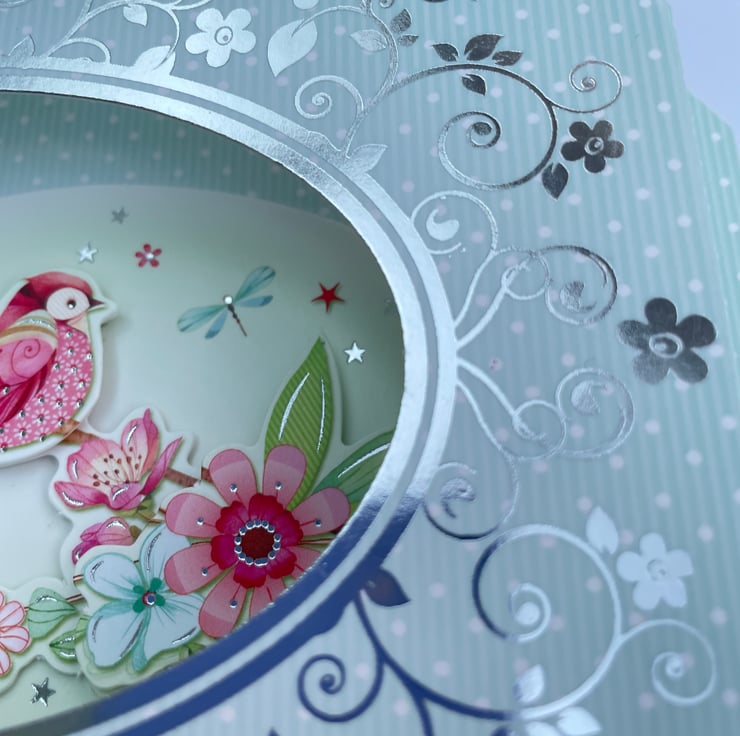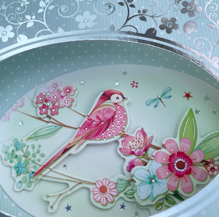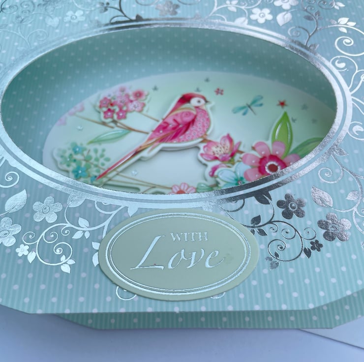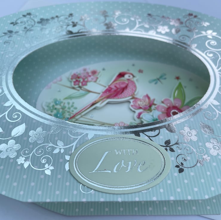 An unusual and pretty card. This approximately A6 sized shaped card has a diorama style. It folds flat but pops open when out of the envelope. It has an oval aperture in the front surrounded with silver flowers and swirls. The background is a pale green with white dots all over. Inside the oval is a decoupaged scene of a colourful bird on a branch of leaves and flowers. There is a greeting on the front which says With Love and a matching greeting on the back. A pretty and feminine card for many occasions.