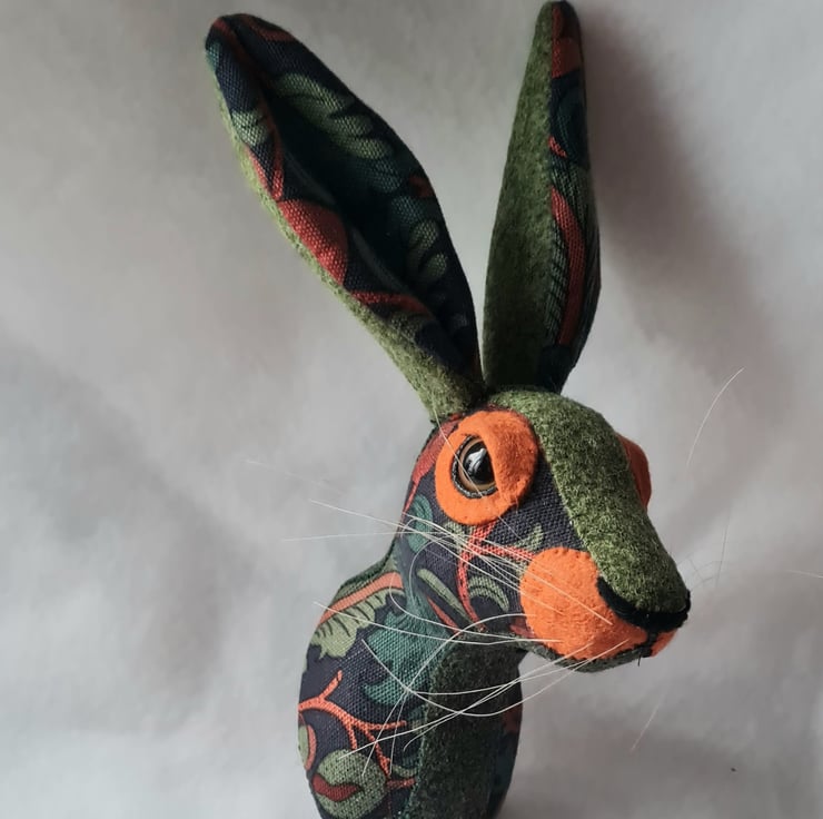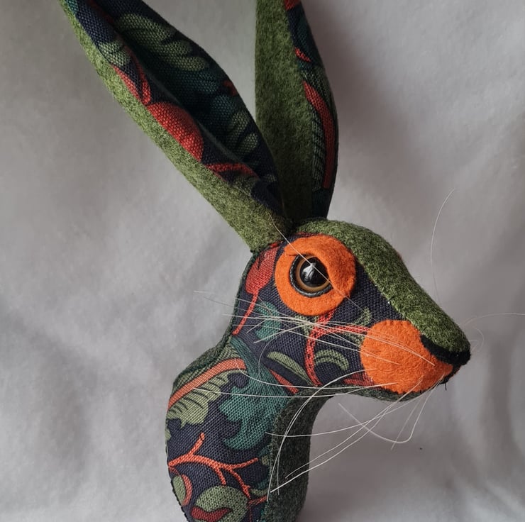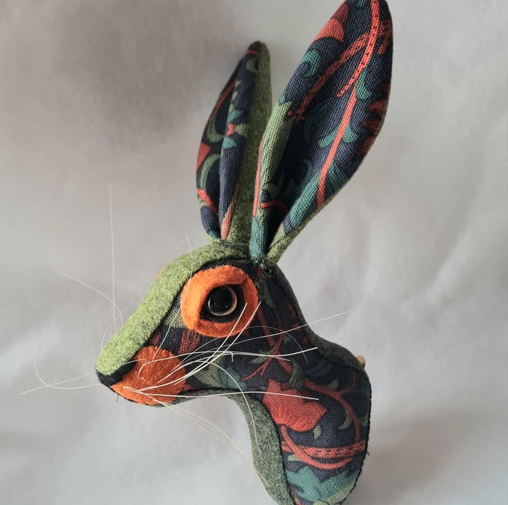 A lifesize faux hare which I have handmade and covered in hand stitched William Morris fabric. The head is backed with felt and has a keyhole metal plate to hang it on the wall. It is lightweight.