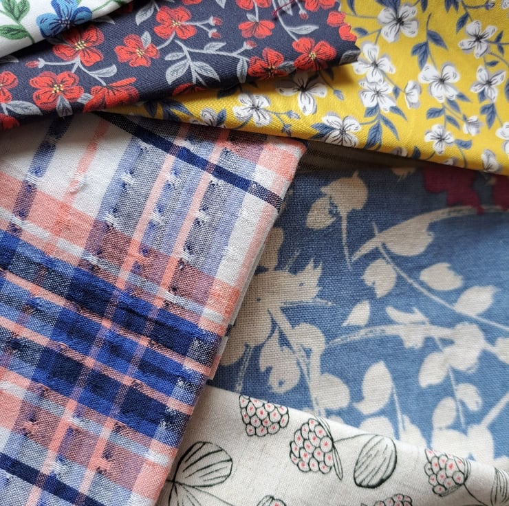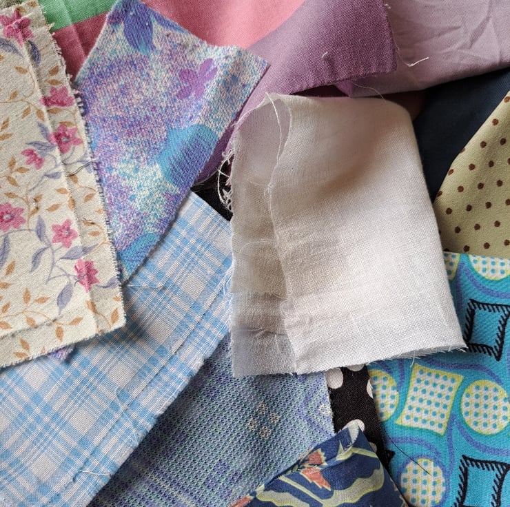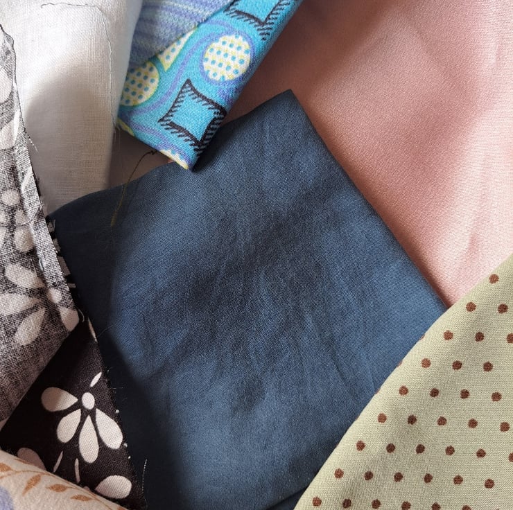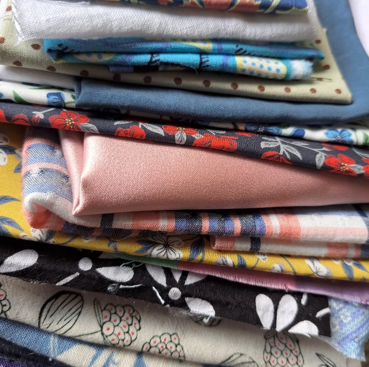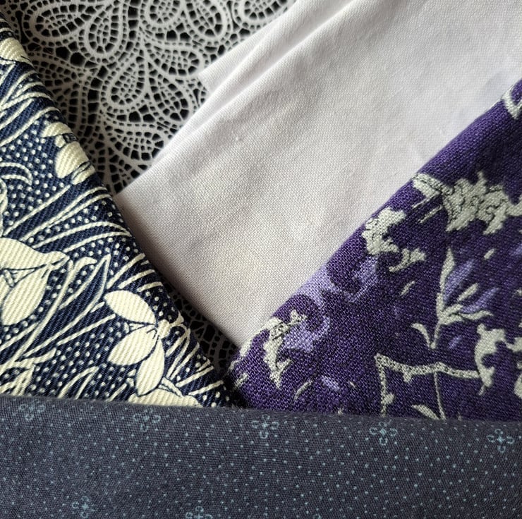 This feel of this 26-piece bundle is of fine, hand-painted porcelain. Largely made up of blue and white but with touches of lavender, pink and purple. There's everything in here: plain and patterned linen, Liberty samples, repurposed cottons, a piece of silk, a piece of satin, some new cotton pieces and - I think best of all - some little squares salvaged from a 1960s of 70s patchwork.