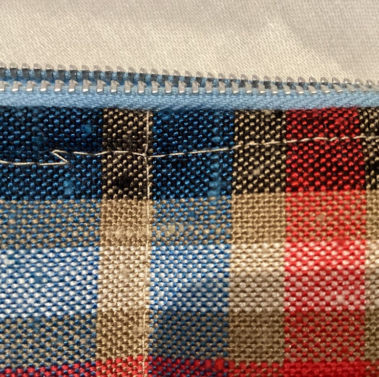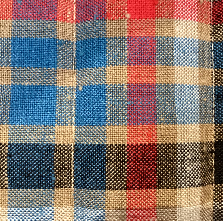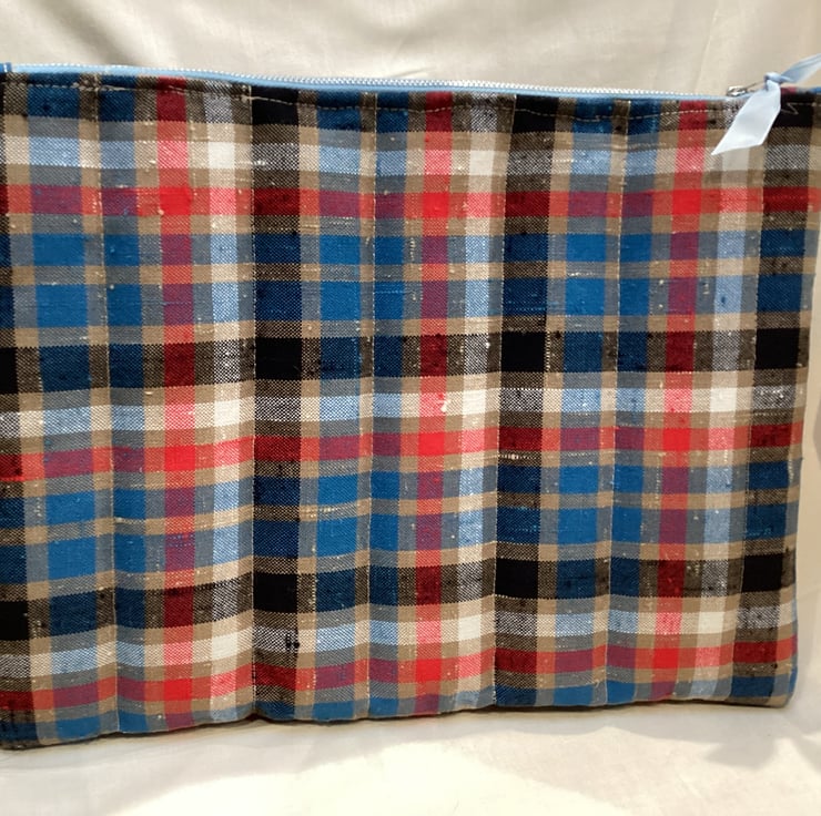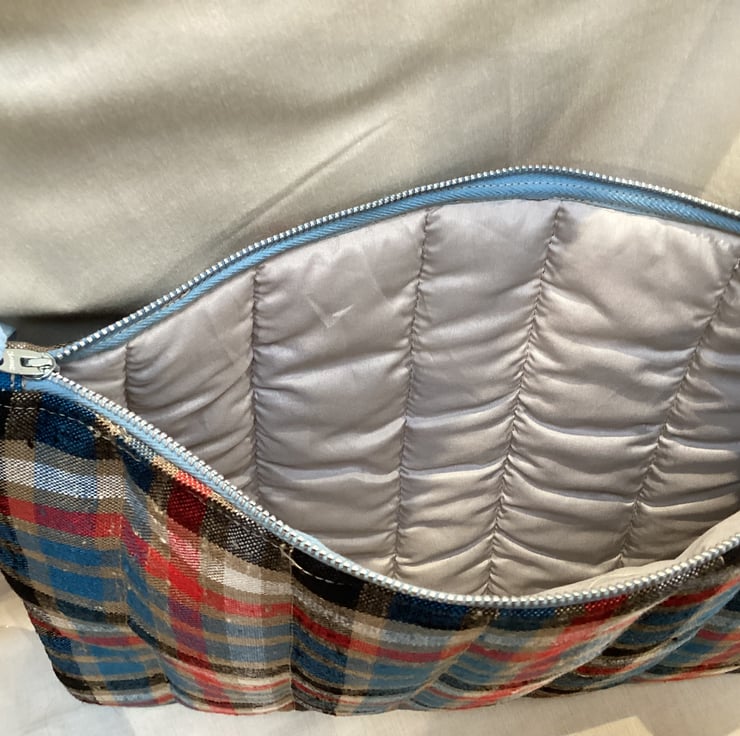 Smart padded bag that will hold A4 sized documents, a small laptop or iPad / tablet. 31x25 cm. Cotton mix check fabric with synthetic grey padded lining. The stitching at the top of the bag isn’t perfect so I am selling at a low price. A close up picture illustrates this but it’s not really noticeable when looking at the bag normally. The smart checked fabric and quilting is stylish and unique, I have only made just this one. Suitable for men or women, you can take the blue ribbon pull off if you wish. Hand washable at 30 degrees.