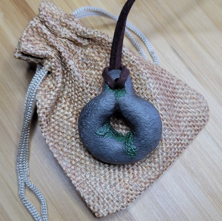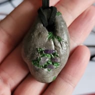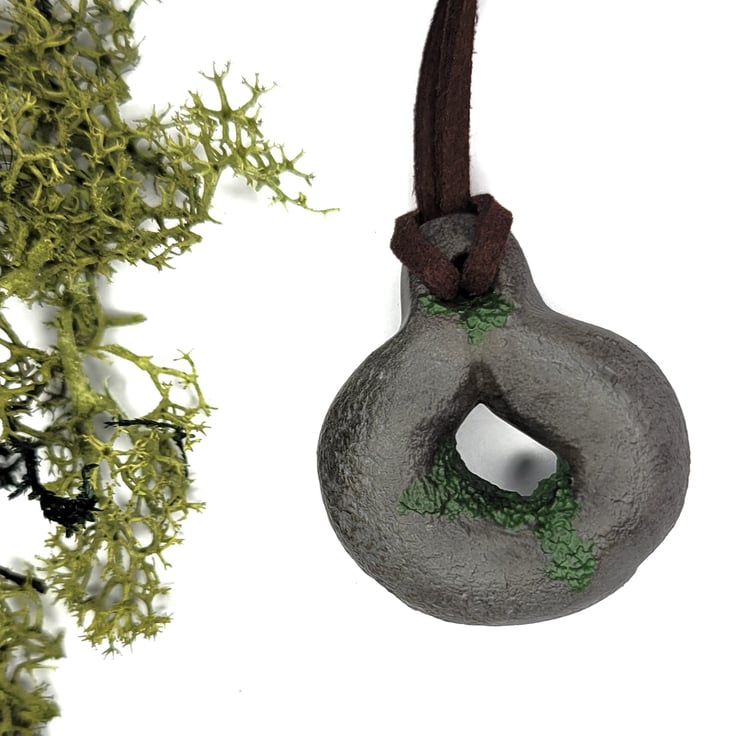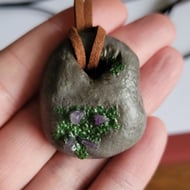 Individually hand sculpted polymer clay pendant. Natural moss covered stone design. Adjustable suede cord. Each piece is truly unique, all original designs, no moulds used.