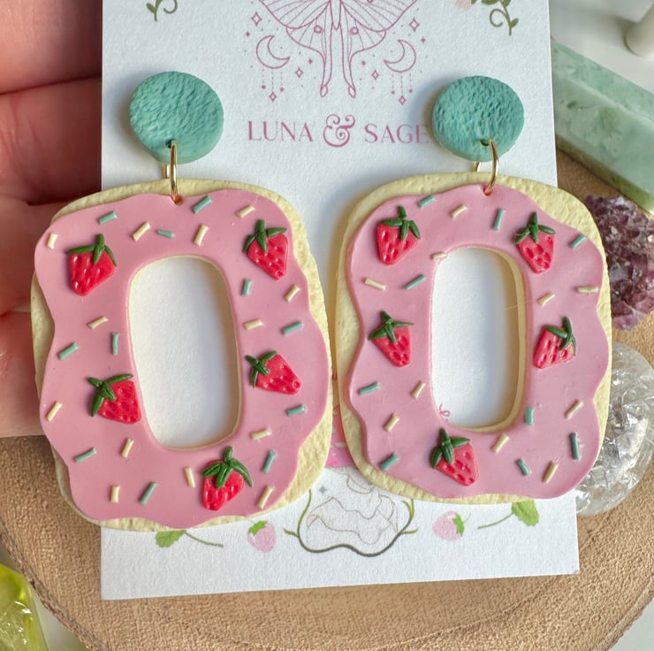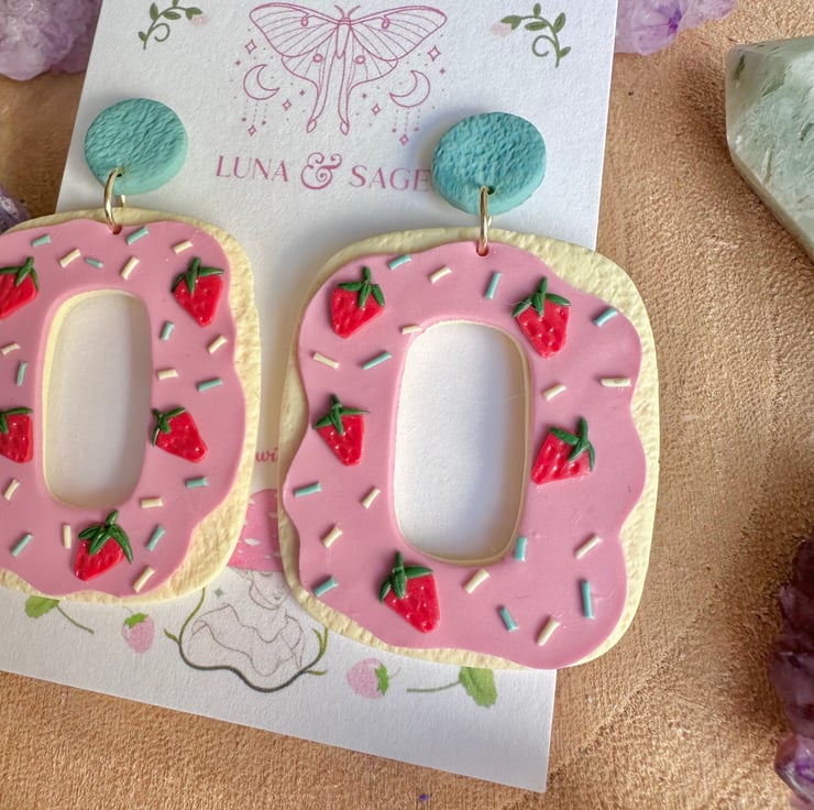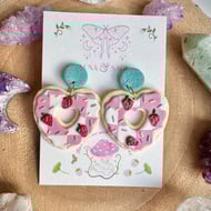 Handmade Cute Strawberry Heart Iced Biscuit doughnut with sprinkles Polymer Clay Earrings with stainless steel findings.