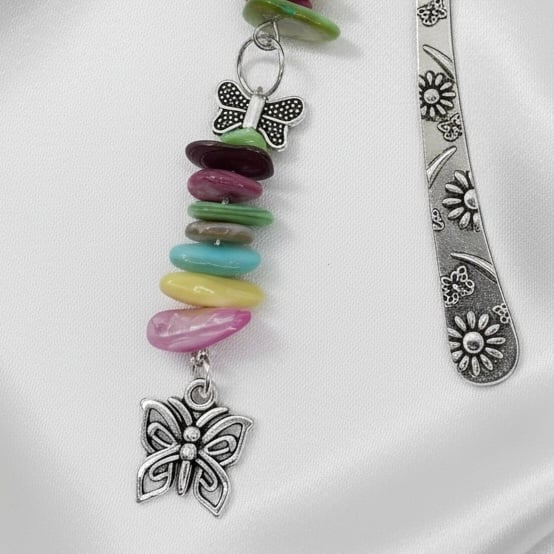 Add a pop of colour to your reading with this handmade bookmark featuring dyed shell chip beads, butterfly spacers, and a delicate butterfly charm. Finished with a sturdy engraved metal hook that easily slips over your page without damaging your book.