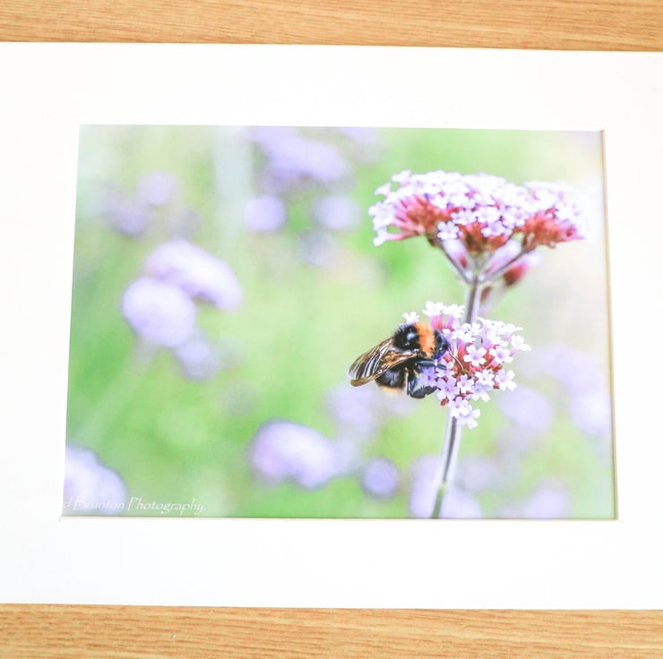 This beautiful image is of a Verbena Flower Head with a Bumble Bee busy feeding on its nectar., This professionally printed photograph is mounted so as to fit a 10 x 8 inch frame,