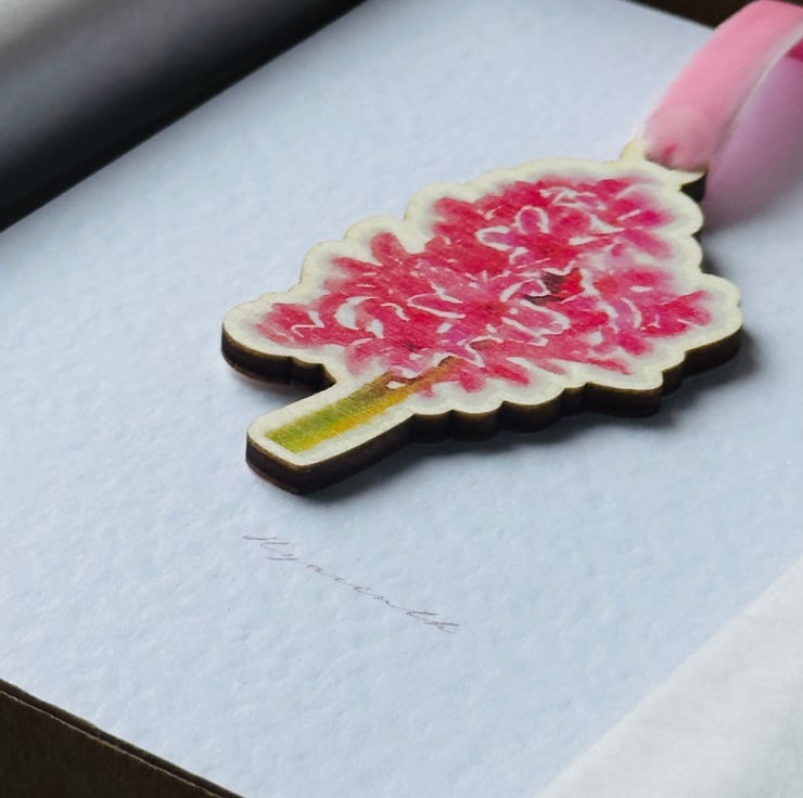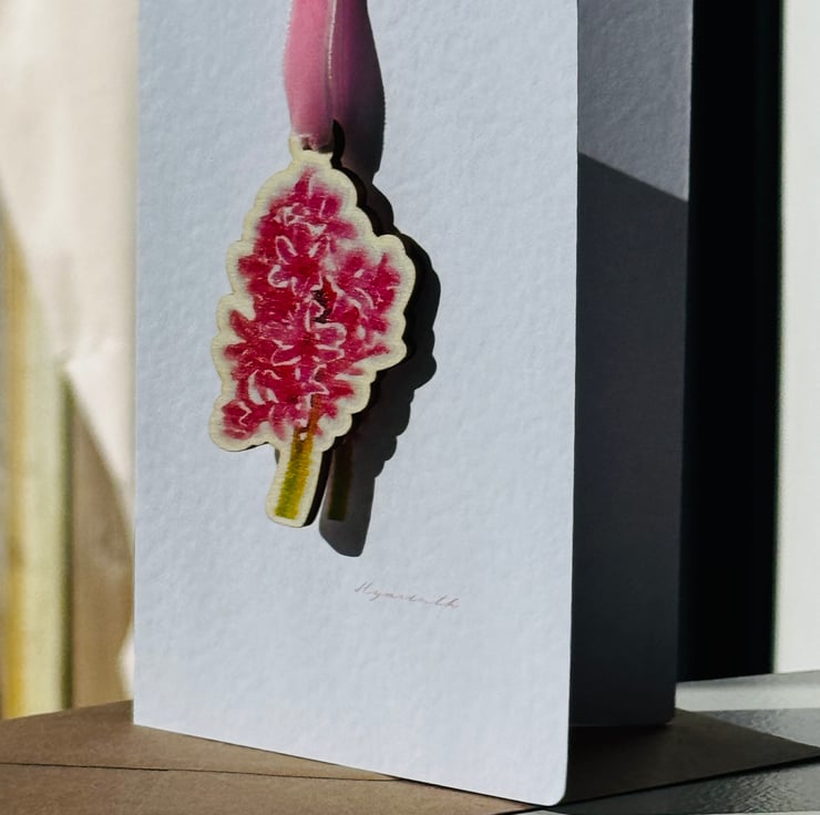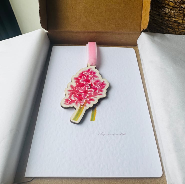 Looking for a small gift and card combo? Then our lovely wooden hyacinth hanging ornament and matching greeting card set could be your thing! This delightful boxed set features a beautifully crafted 65mmmm wooden ornament, complete with a soft pink velvet ribbon, and a blank A6 greeting card with a kraft envelope, perfect for your heartfelt message. Made from sustainably sourced wood and printed with eco-friendly inks, this set not only looks stunning but also supports the planet. Plus, enjoy hassle-free shipping with Royal Mail Tracked 48 with your first item, and any additional items are added for free! Show your love in style!