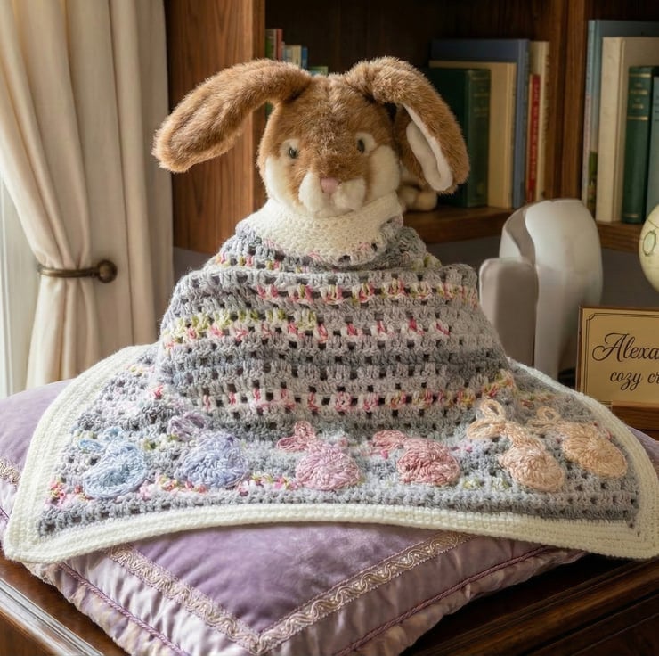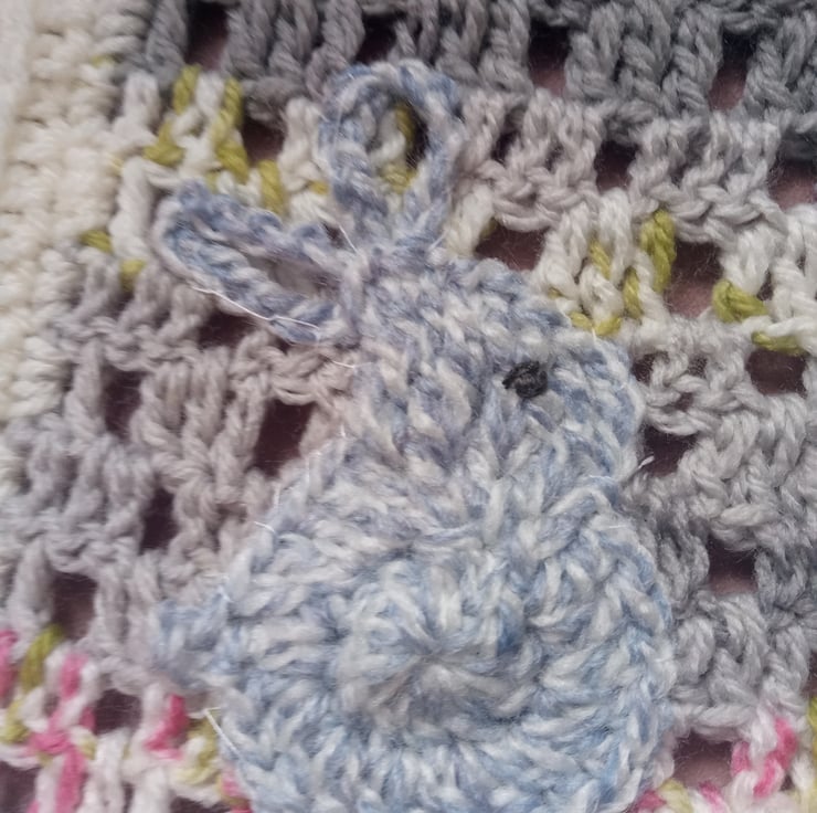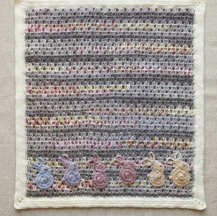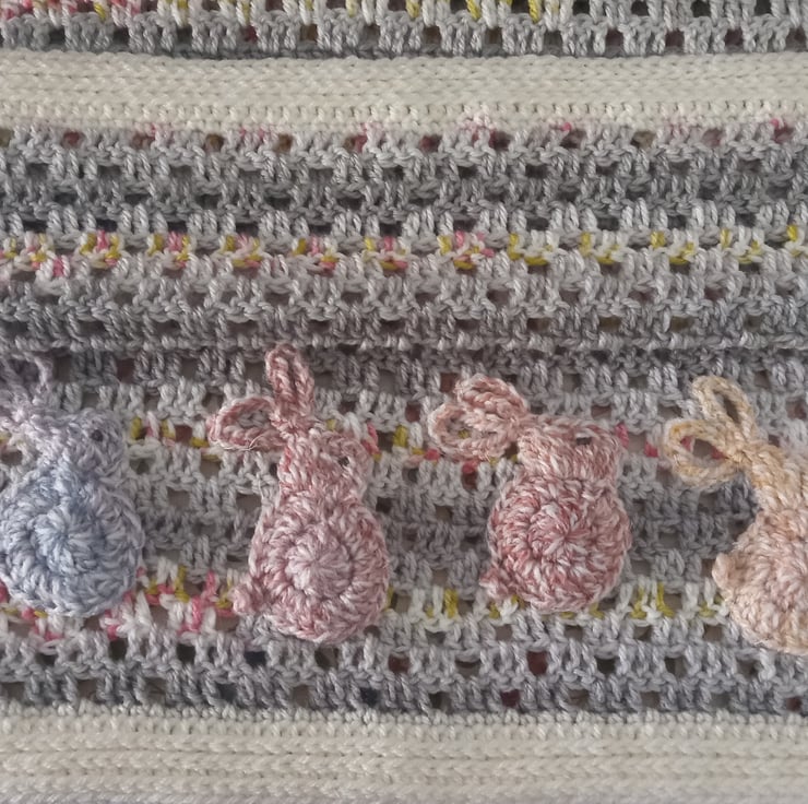 The blanket features six hand-crocheted bunny rabbits sewn onto the blanket in a repeating pattern. Each bunny has embroidered eyes, and each one has slight individual differences in character and finish.