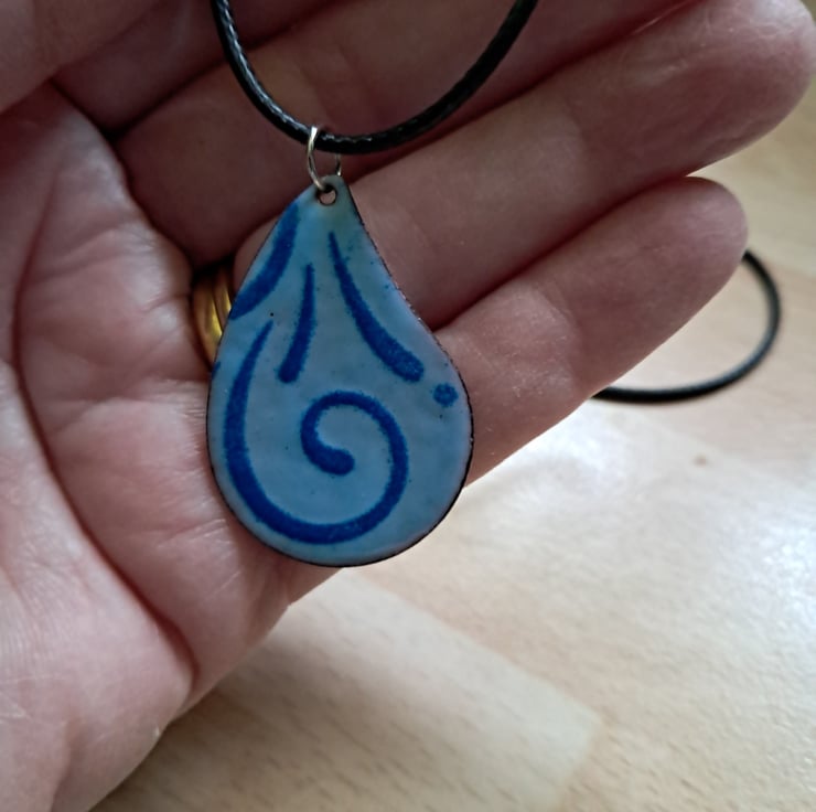 This pendant is made with enamelled fired onto copper to give a durable finish. It measures 3 x 4cm. The design is created by stencilling a design in a contrasting colour to the base, in this case dark blue on light blue. The reverse is also enamelled in dark blue. It is strung with a soft leather thong.