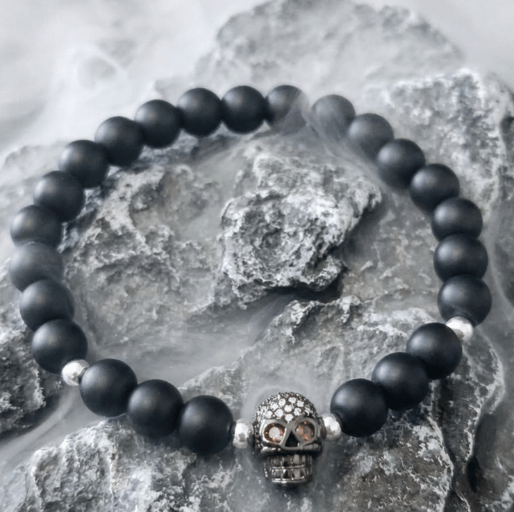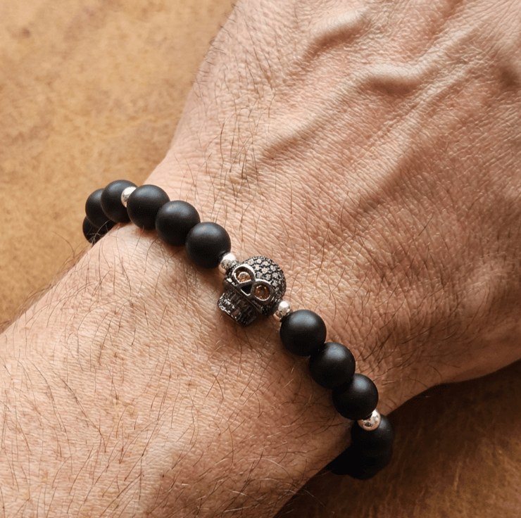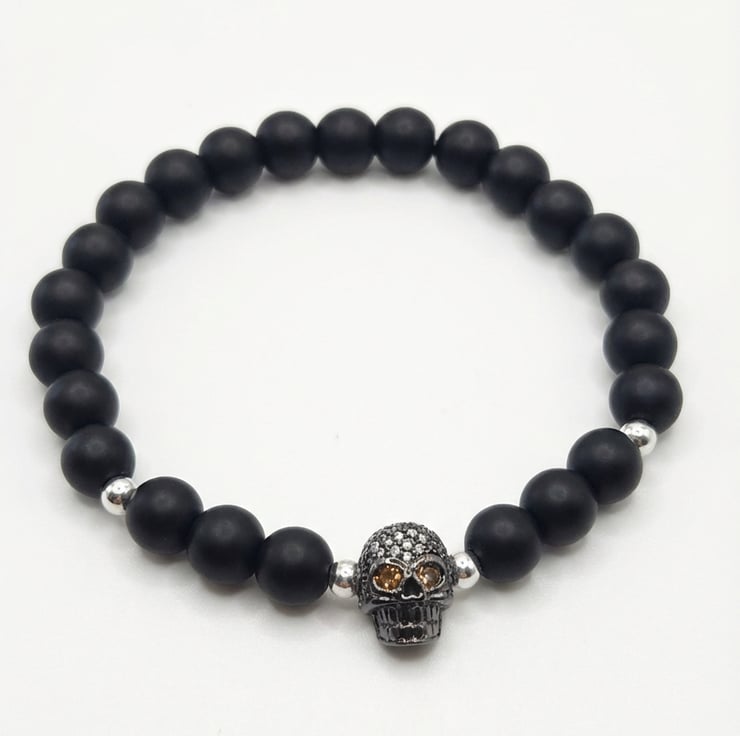 Handmade with love and care using only the finest materials. Beautiful matt black beaded stretch bracelet with 4mm silver plated spacers. Personalised with a stunning black cubic zirconia skull head charm bead.