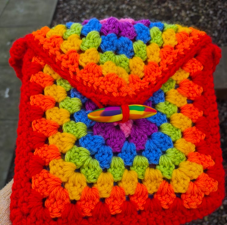 This is my own crochet designed bag, it also has a handmade toggle fastening and it is fully lined with a wee pocket inside.