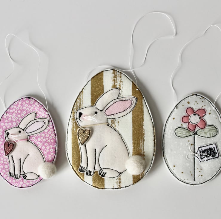 Each egg is sewn using combinations of 100% wool felt, cotton cloth, glitter cloth and free hand machine embroidery; multiple layers of cloth are sewn together and cut out by hand using very sharp scissors. With a linen string to suspend.