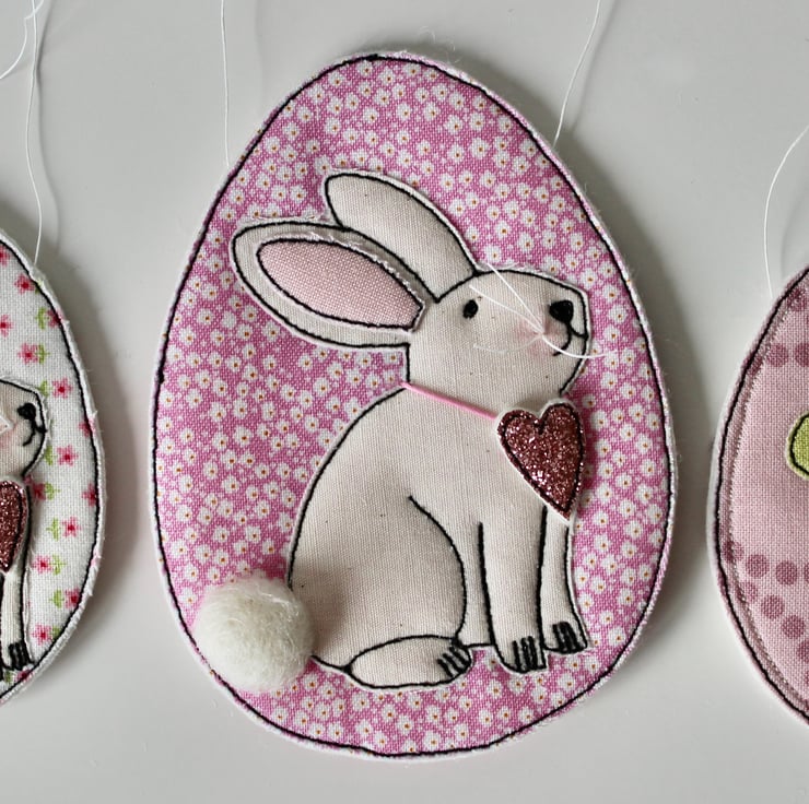 Each egg is sewn using combinations of 100% wool felt, cotton cloth, glitter cloth and free hand machine embroidery; multiple layers of cloth are sewn together and cut out by hand using very sharp scissors. With a linen string to suspend.