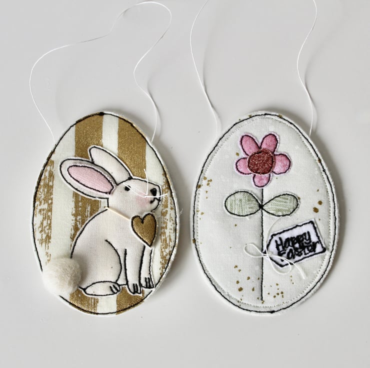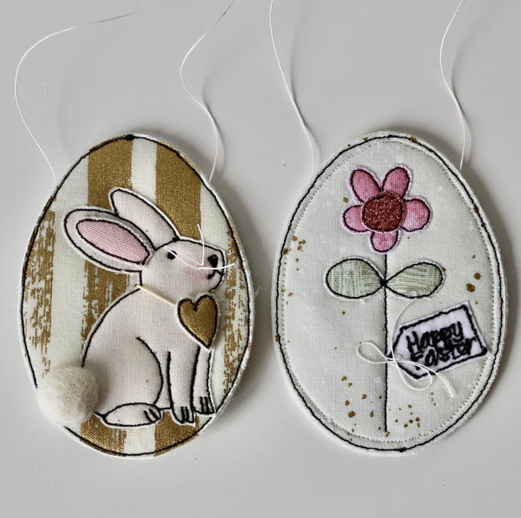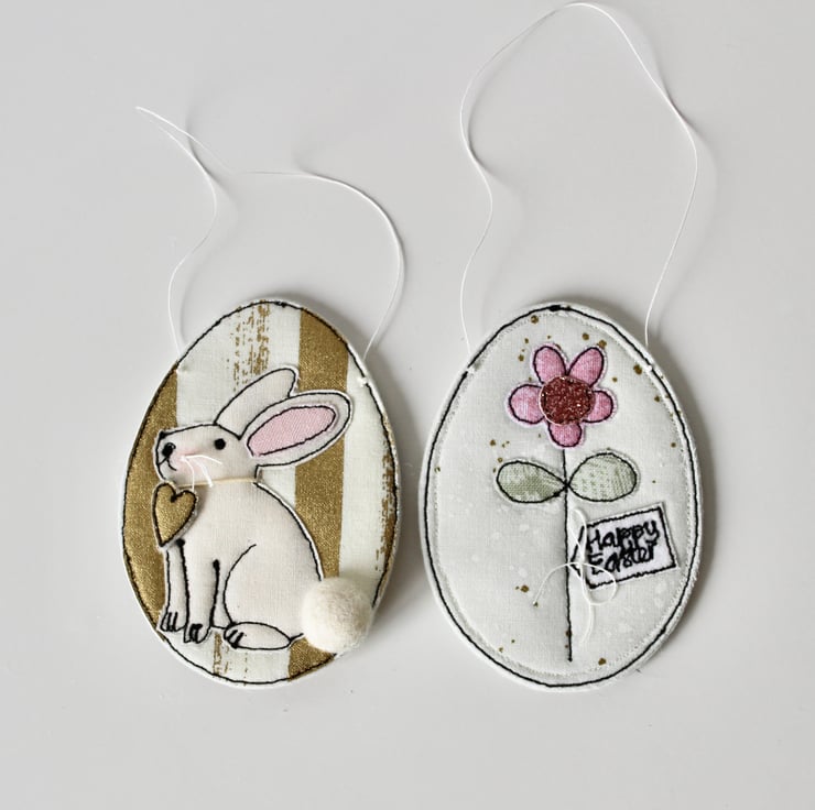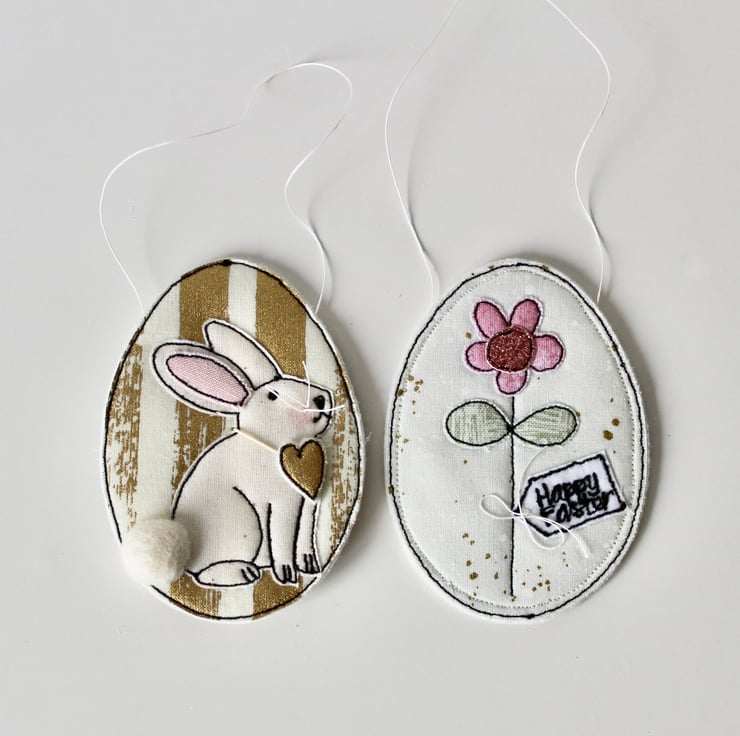 Each egg is sewn using combinations of 100% wool felt, cotton cloth, glitter cloth and free hand machine embroidery; multiple layers of cloth are sewn together and cut out by hand using very sharp scissors. With a linen string to suspend.